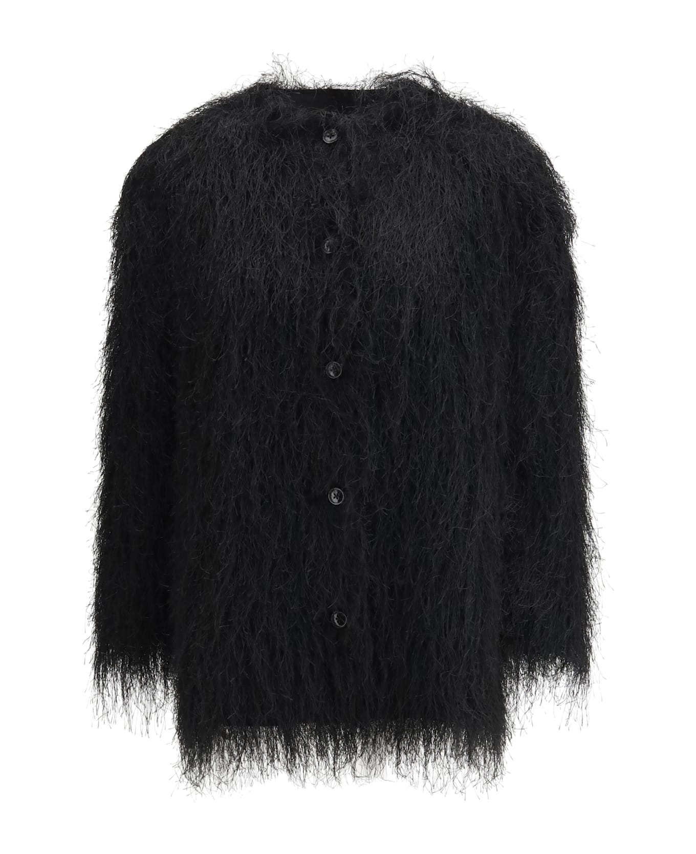The filippo fringed coat by loulou de saison is crafted from a distinctive fringed fabric that adds texture and movement to the design. defined by softly rounded lines and a short, generous fit, it features a clean collarless neckline and a five-button front closure. the result is a cocoon-like silhouette that feels both modern and enveloping, perfect for effortless layering with a refined, contemporary attitude.