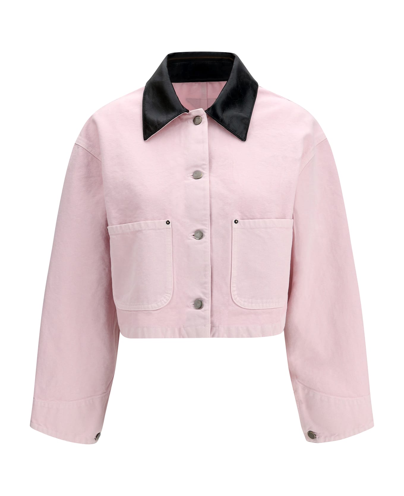 The denim jacket by prada is a bold and contemporary piece, with a leather collar that adds a sophisticated textural contrast. the front button closure and patch pockets complete the practical and stylish design. the cropped fit and oversized sleeves give it a modern, relaxed fit, perfect for creating urban, on-trend looks. a versatile piece that combines denim and leather for a mix of elegance and edge. Composition: 100% % Cotton