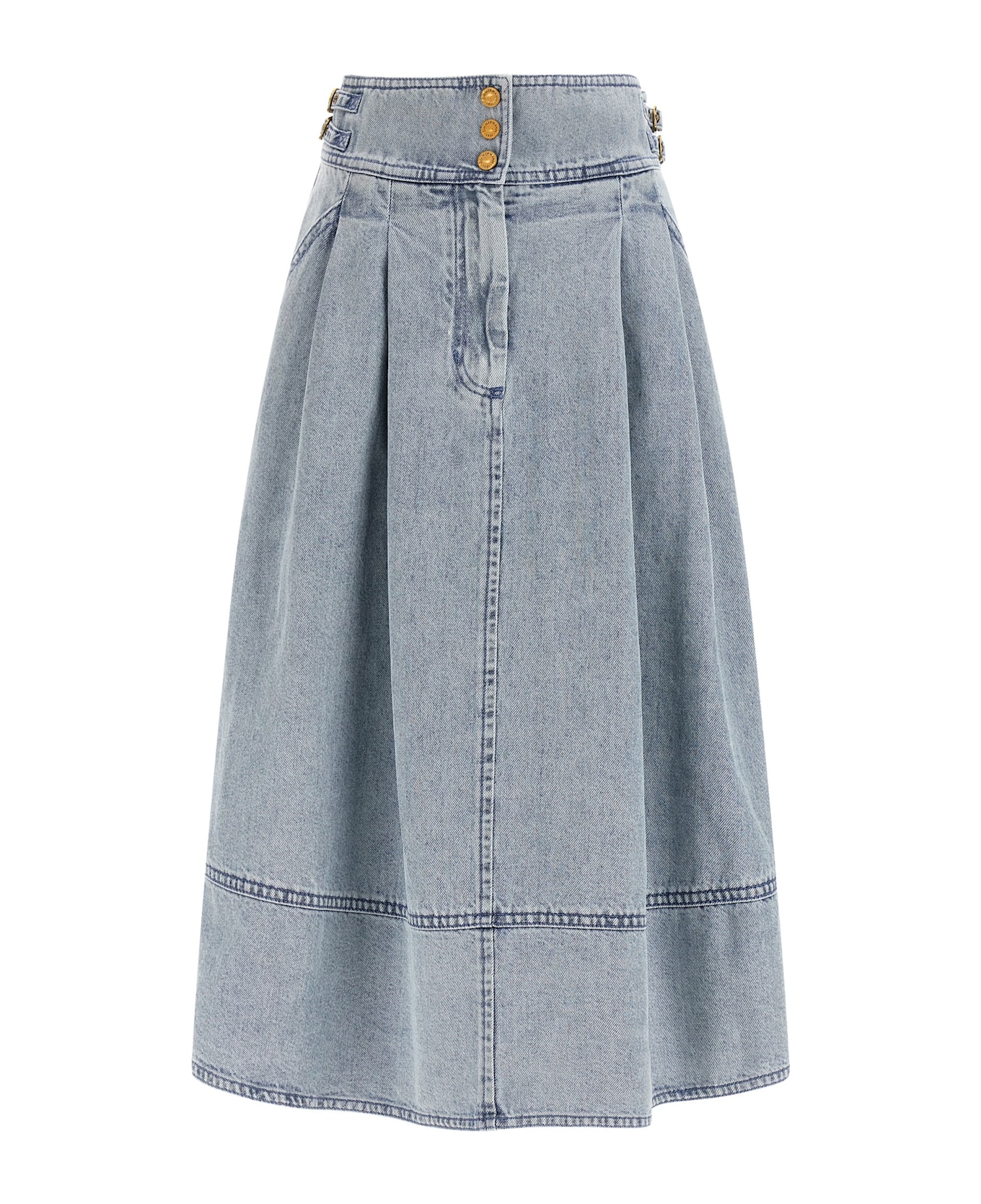 Cotton denim midi skirt, high waist, A-line silhouette, front and back pin tucks, front zip and snap button closure on the front, adjustable side straps, pockets. Composition: 100% cotton