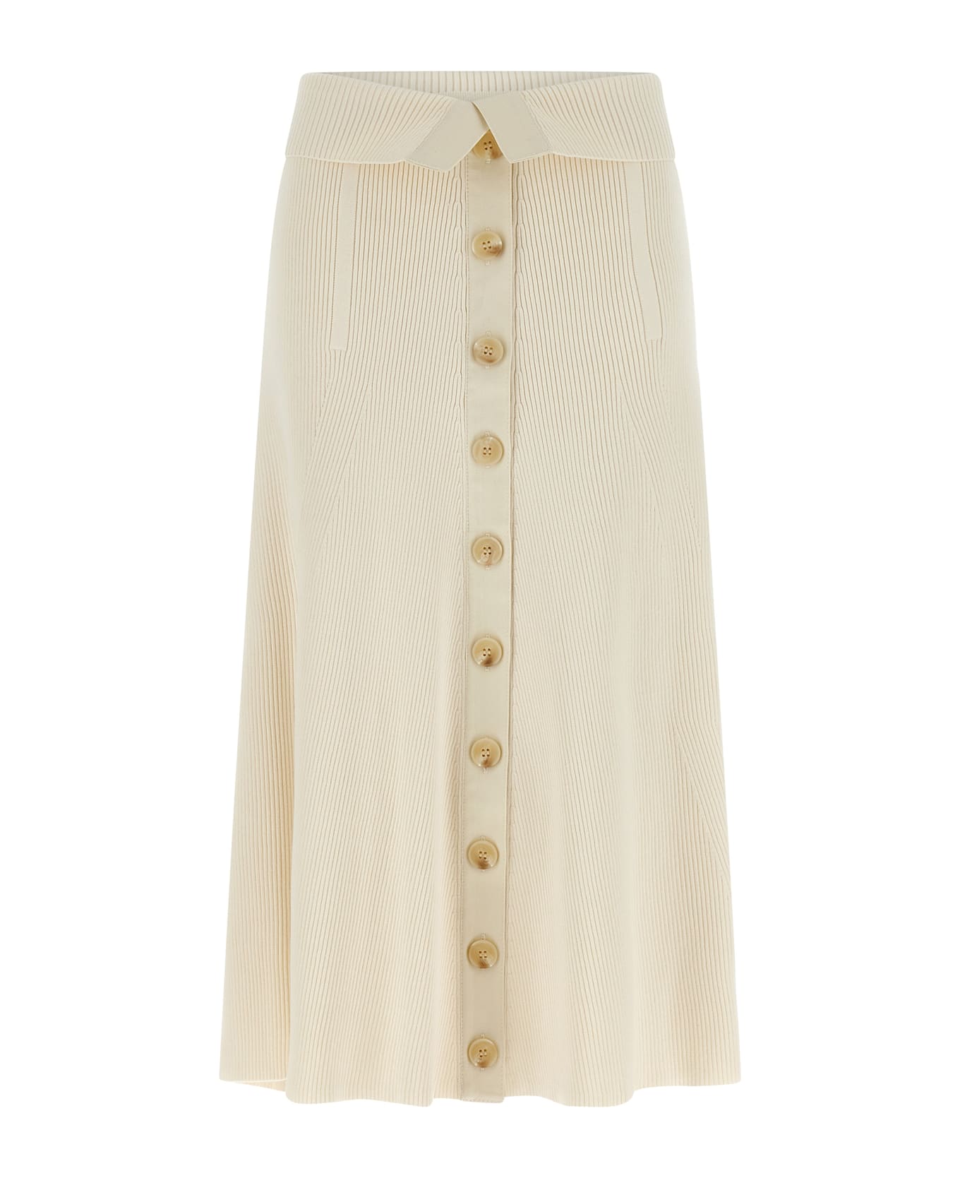 'Rebellion' ribbed stretch viscose midi skirt, A-line silhouette, button closure and front trompe l'oeil pockets, turn-up at the waist. Composition: 72% viscose, 28% polyester