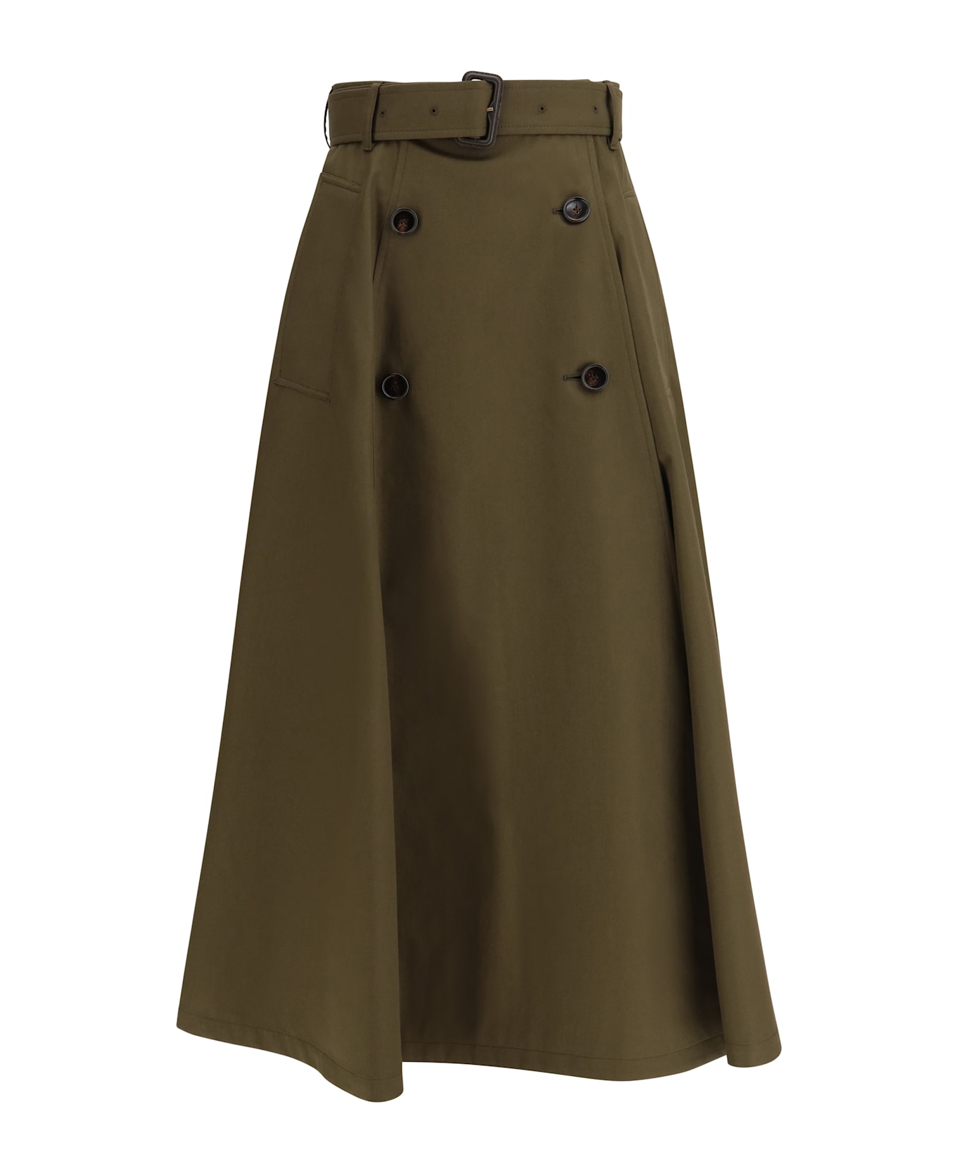 The trench midi skirt by burberry reimagines an iconic house style with contemporary elegance. crafted from water-resistant cotton gabardine, it features a wrap closure with button and hook for a clean, structured look. the high-rise waist with belt loops is finished with a matching adjustable and removable belt, detailed with a leather b buckle, an iconic signature. side welt pockets add discreet functionality, completing this refined, versatile piece.