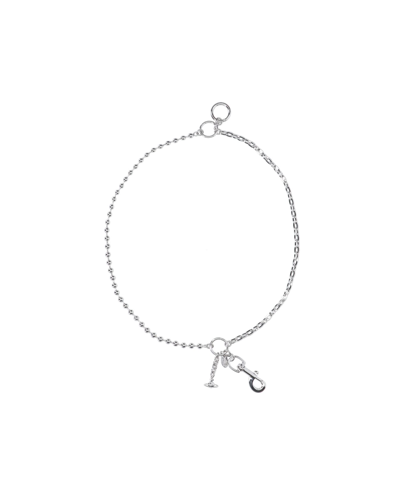 Vivienne Westwood 'Orb' bracelet in brass and silver zamak, clasp closure, 'orb' logo charm, carabiner charm. Composition: 70% Brass, 20% Zamak, 10% Iron