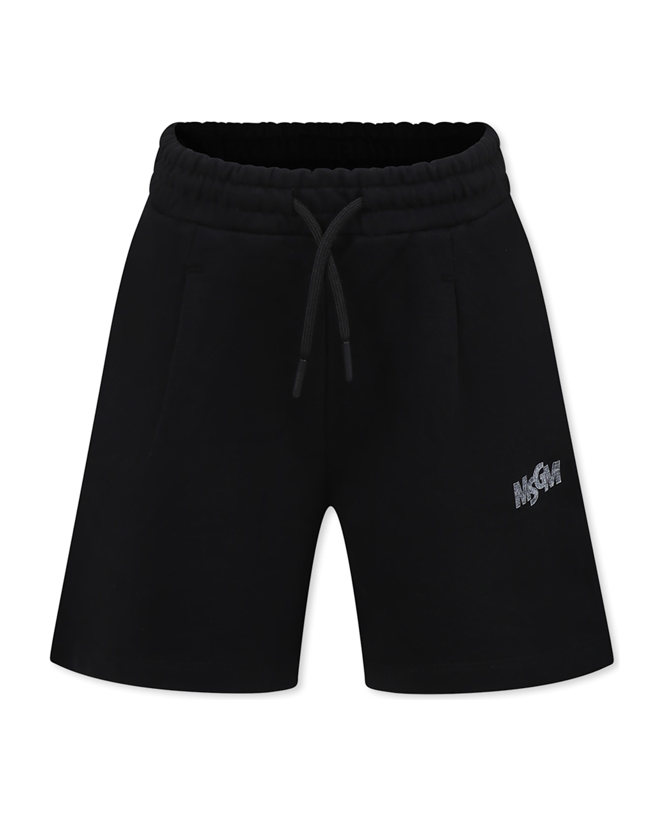 Black shorts in brushed cotton, with elasticated waist, drawstring and side pockets. They are embellished with a white logo on one leg.