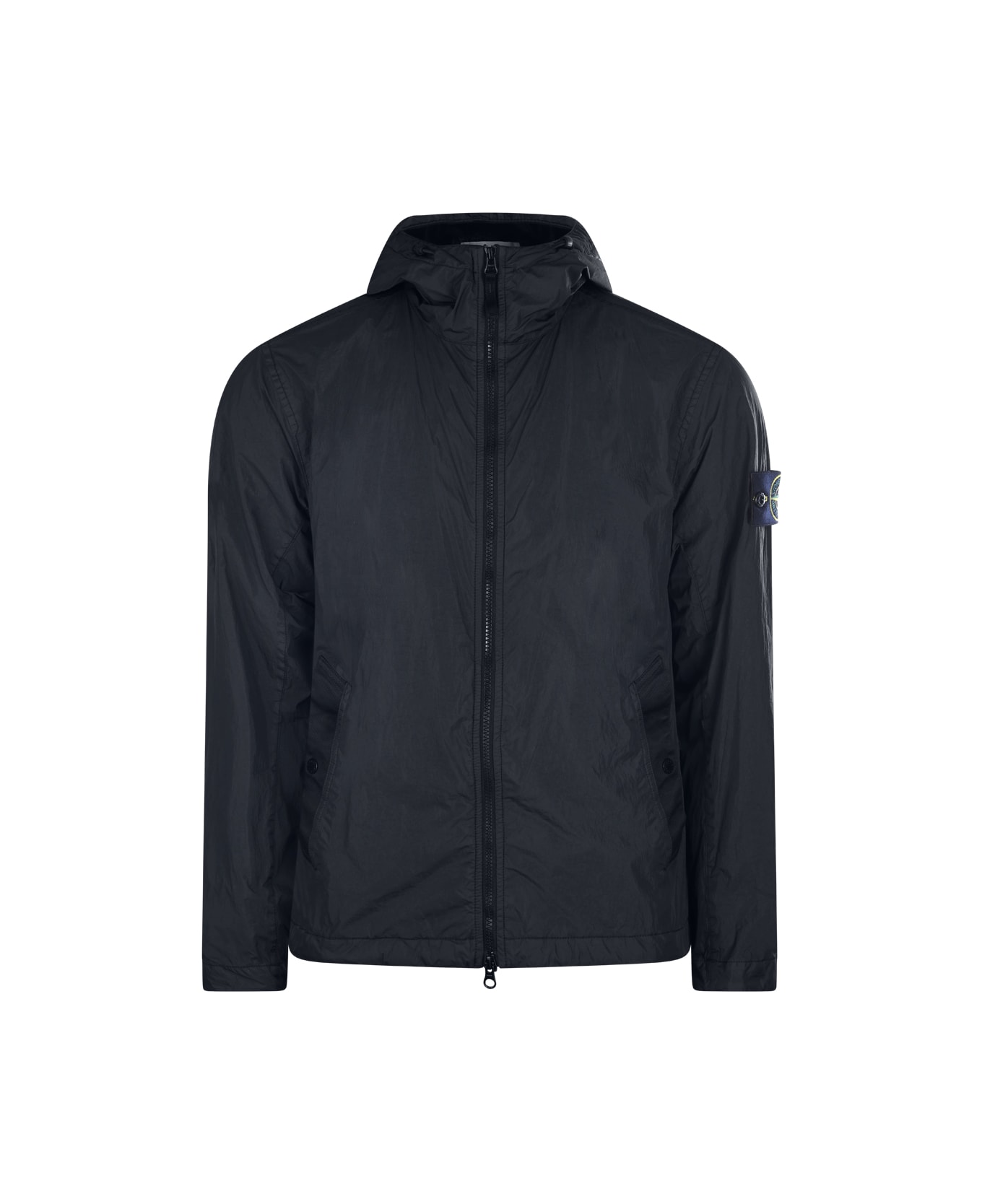 Black casual jacket from Stone Island featuring hood, zip fastening, long sleeves, pockets, lateral logo patch and regular vestibility. Composition: _, 100% Polyamide