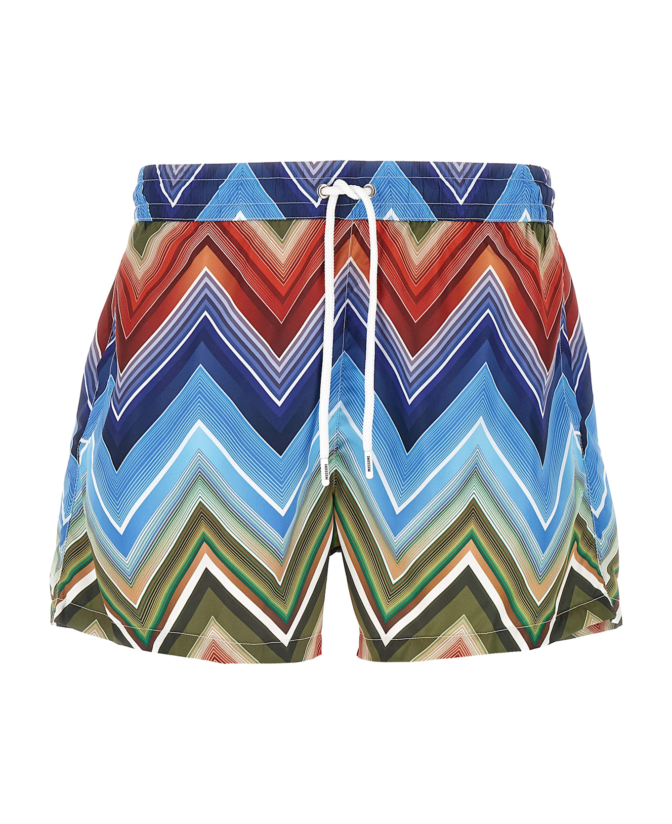 Swimsuit in technical fabric with macro zigzag print, drawstring elastic waistband, pockets, inner mesh briefs.