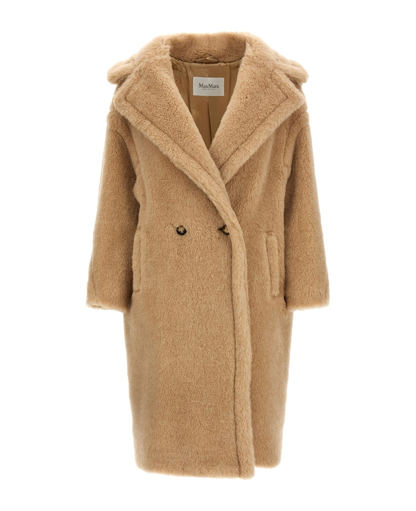 Tedgirl - Teddy Bear Icon' double-breasted coat in alpaca and wool on silk base with front horn button closure, lapel collar, pockets, long sleeves with dropped shoulders, and M monogram jacquard viscose lining.