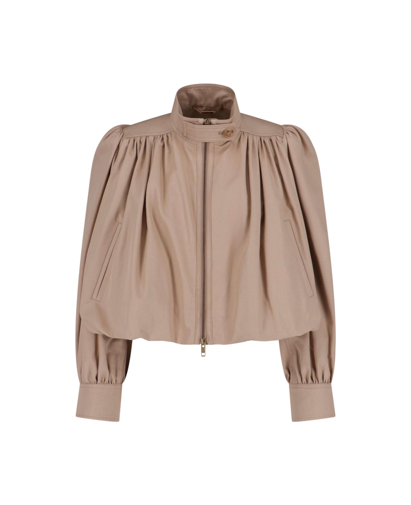 Chloé curled jacket in beige cotton gabardine with high neck, button and zip closure, all-over curled details, long sleeves, two side pockets, button cuffs, straight hem. Composition: 100% Cotton