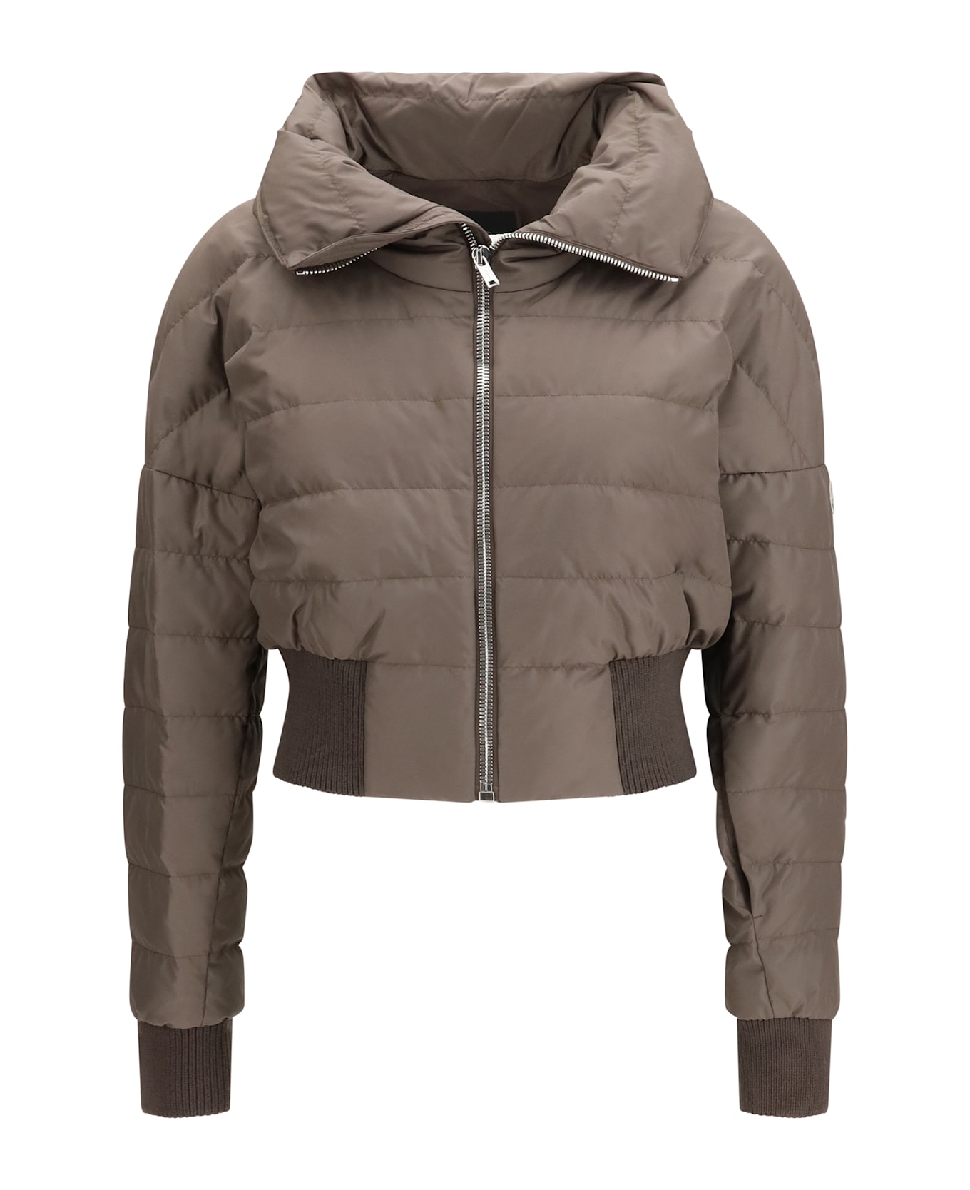 The down jacket by moncler + rick owens is a lightweight, quilted style, perfect for an elegant and functional look. the ribbed wool hem and cuffs offer comfort and a flawless fit, while the high collar adds a touch of style. the front zipper closure ensures practicality, while the iconic logo patch on the left arm gives the garment a distinctive, high-fashion detail.
