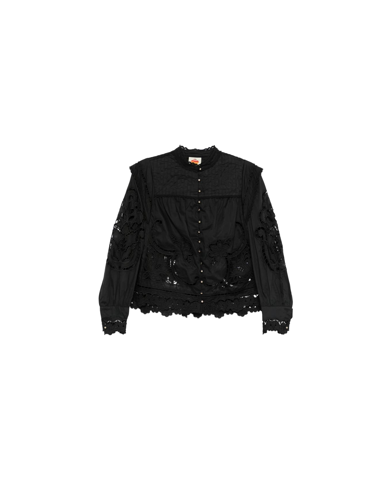 black cut-out detailing scalloped trim mock neck front button fastening long sleeves