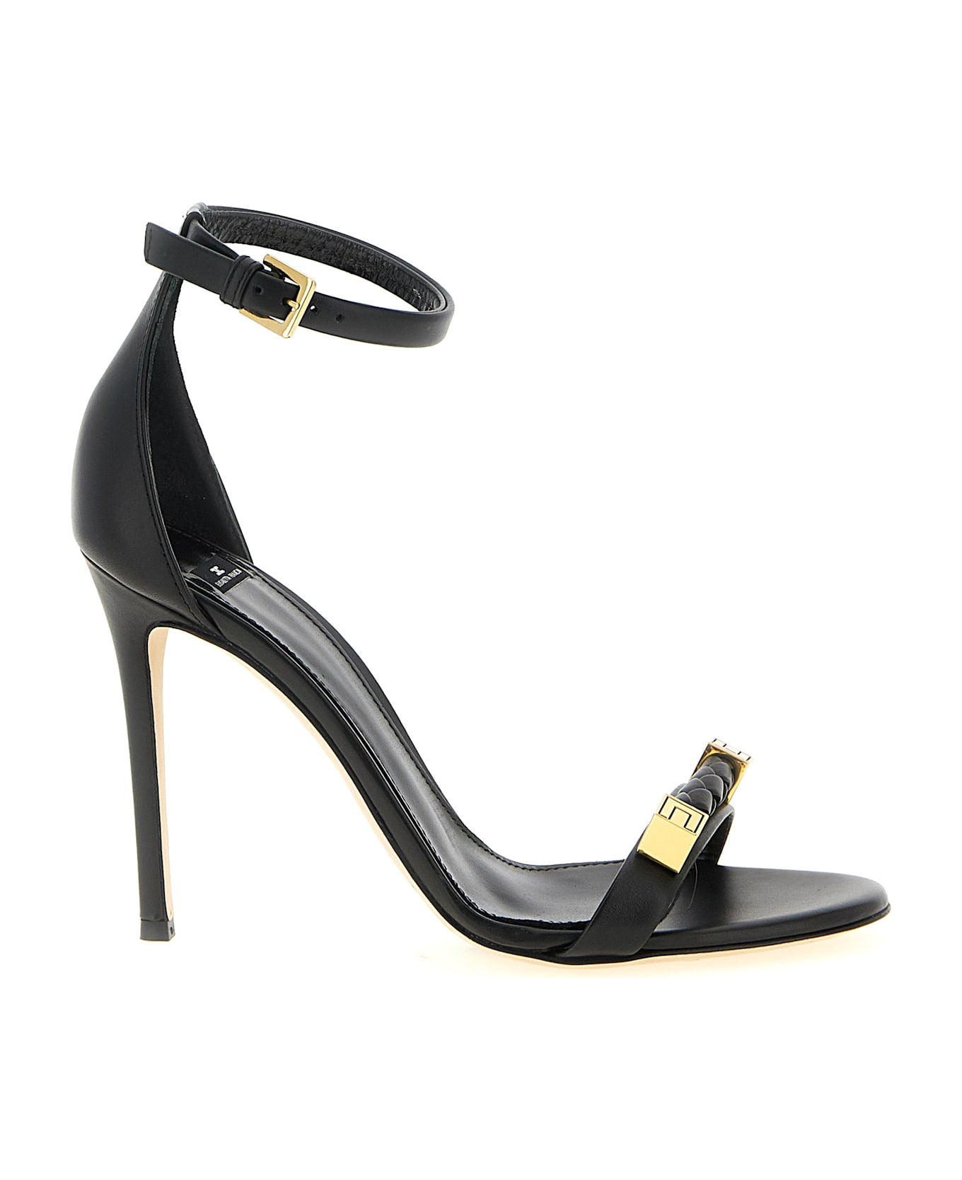 Leather sandal, front detail in woven leather with logo metal cubes, adjustable ankle strap, stiletto heel, leather sole.
