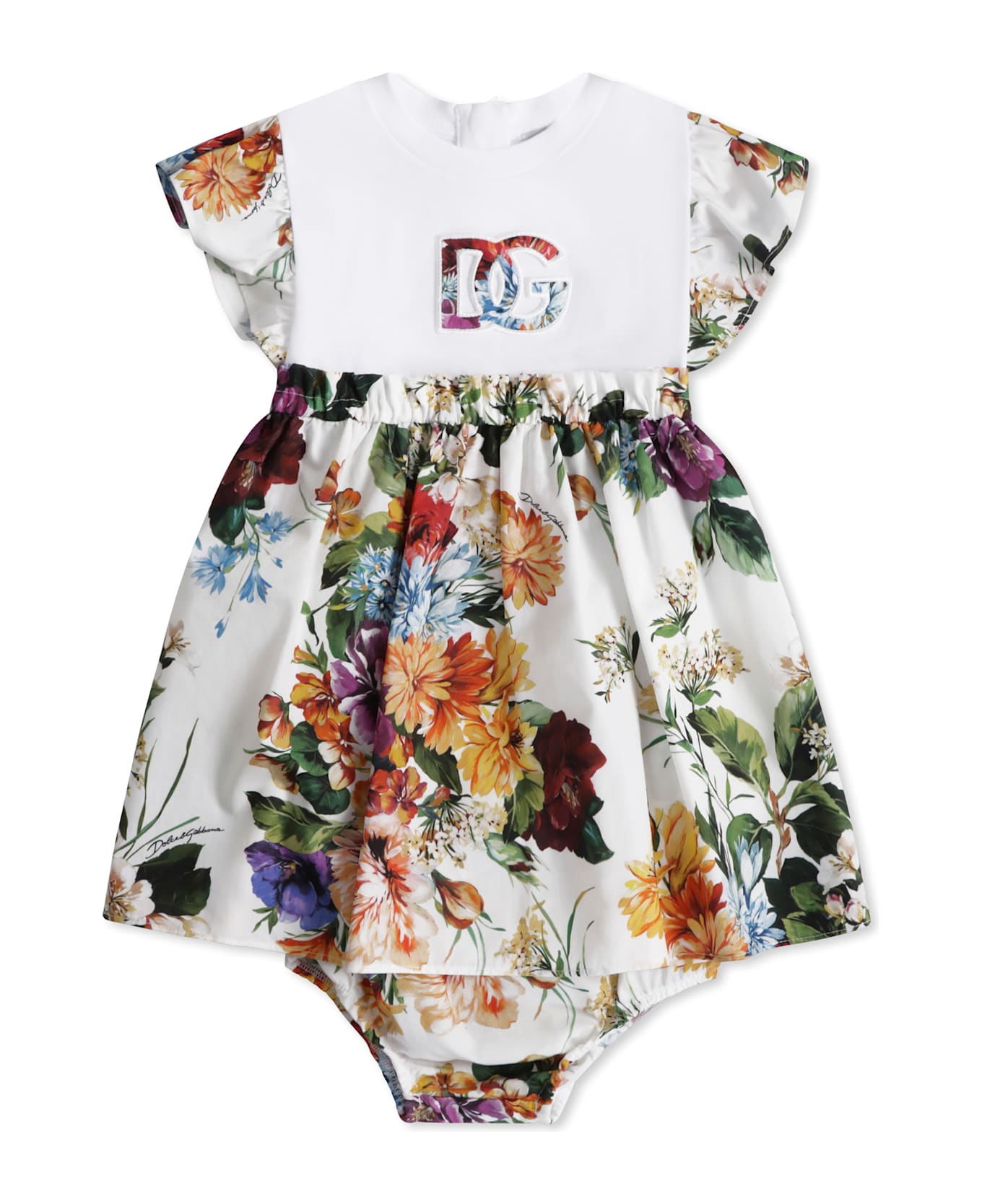 Ivory dress from the luxury brand Dolce & Gabbana Kids, made of cotton, with short sleeves with floral print, a ribbed crew neck, back zip closure, cotton poplin skirt with an all-over floral print, elastic waist and culottes. It is embellished with DG monogram embroidered on the front.
