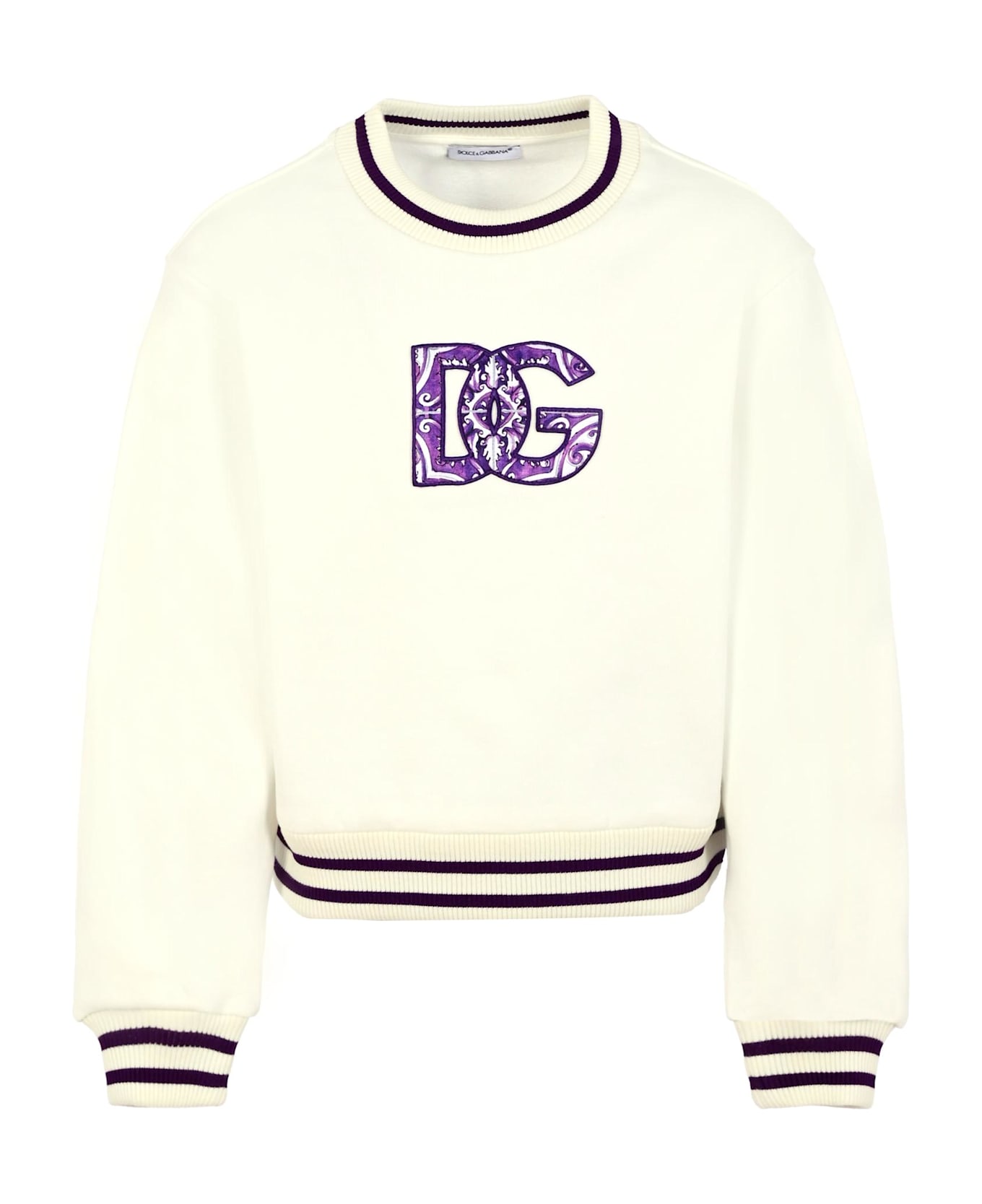 Ivory crop sweatshirt from the luxury brand Dolce and Gabbana Kids, made of brushed cotton. It features long sleeves, a crew neck, ribbed cuffs and hem with purple stripes. It is embellished with a majolica print in shades of purple with DG embroidery, on the front.