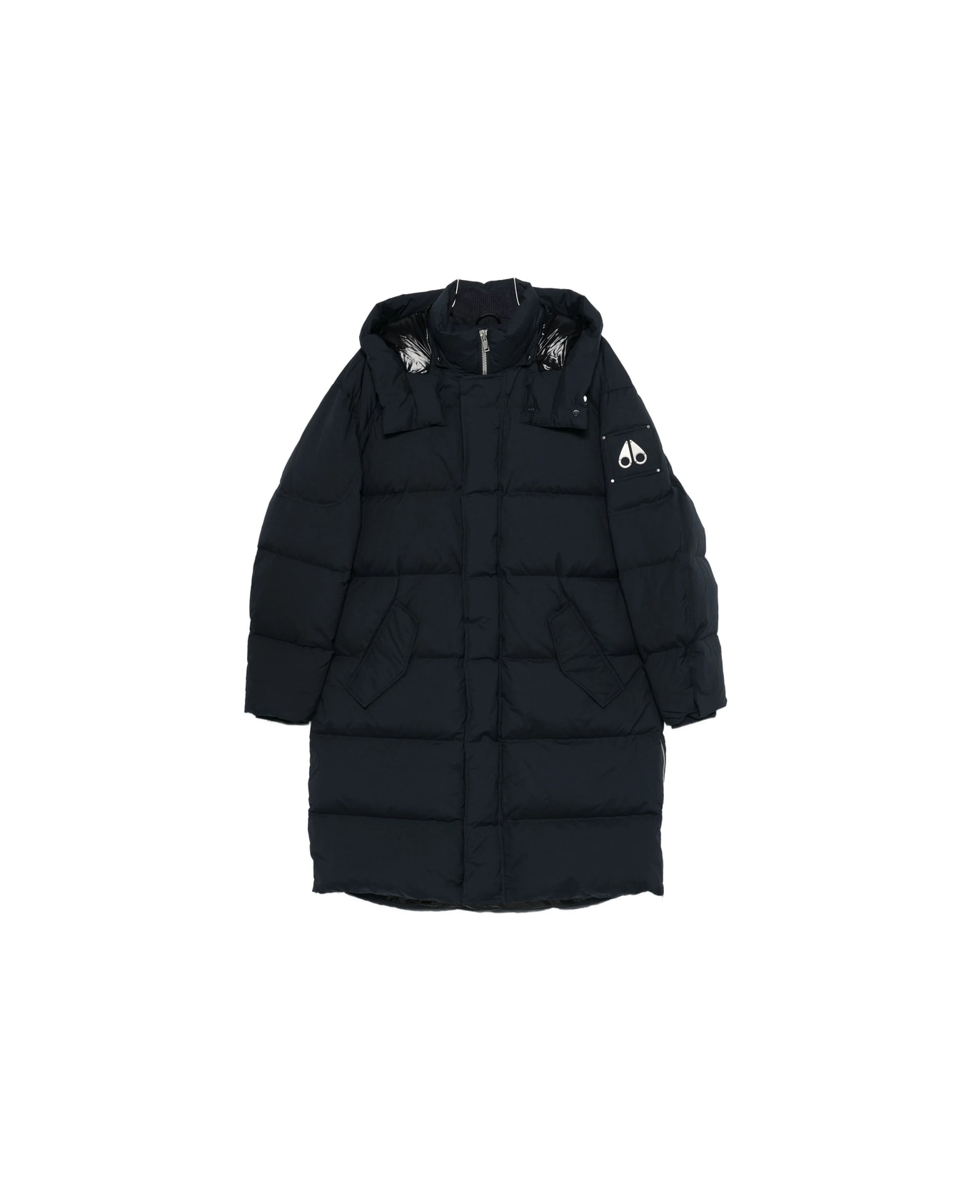 dark blue padded design logo patch front zip fastening detachable hood front flap pockets