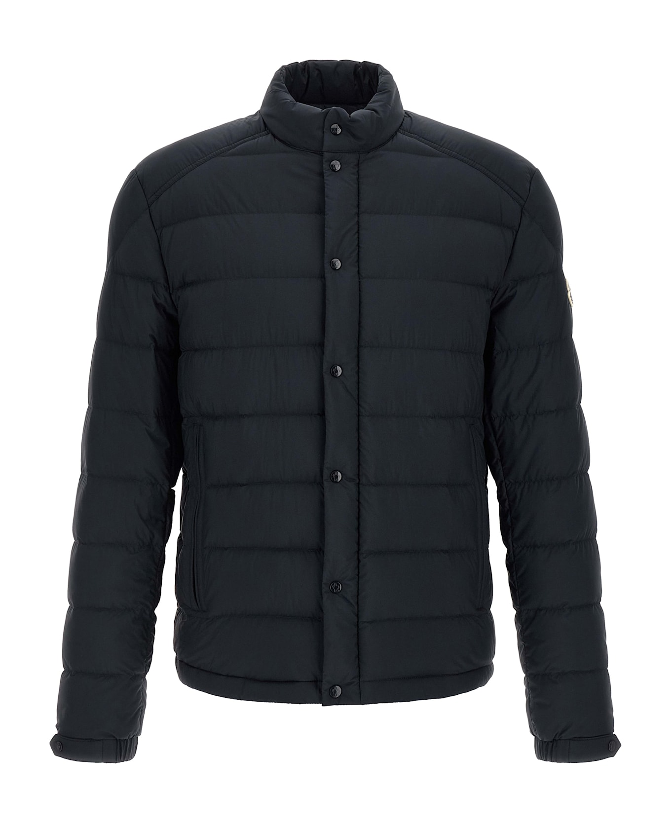 Short 'Selves' down jacket in water-repellent saison longue quilted and slightly padded with goose down, standing collar, front zip and snap button closure, pockets, long sleeves with adjustable elastic cuffs, felt logo patch, drawstring on the hem.