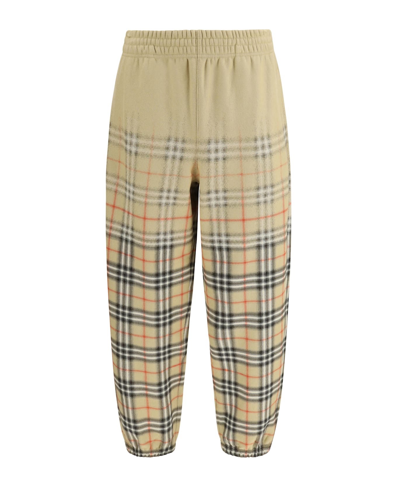 The cotton sweatpants by burberry with a faded check pattern offer the perfect blend of comfort and style. crafted from lightweight terry cotton, they feature a comfortable, relaxed fit. the design is enhanced by the burberry check print, which gradually fades into a solid color for a unique and sophisticated look. the internal drawstring waist and side patch pockets, together with the back patch pocket, add practicality without compromising on casual elegance.