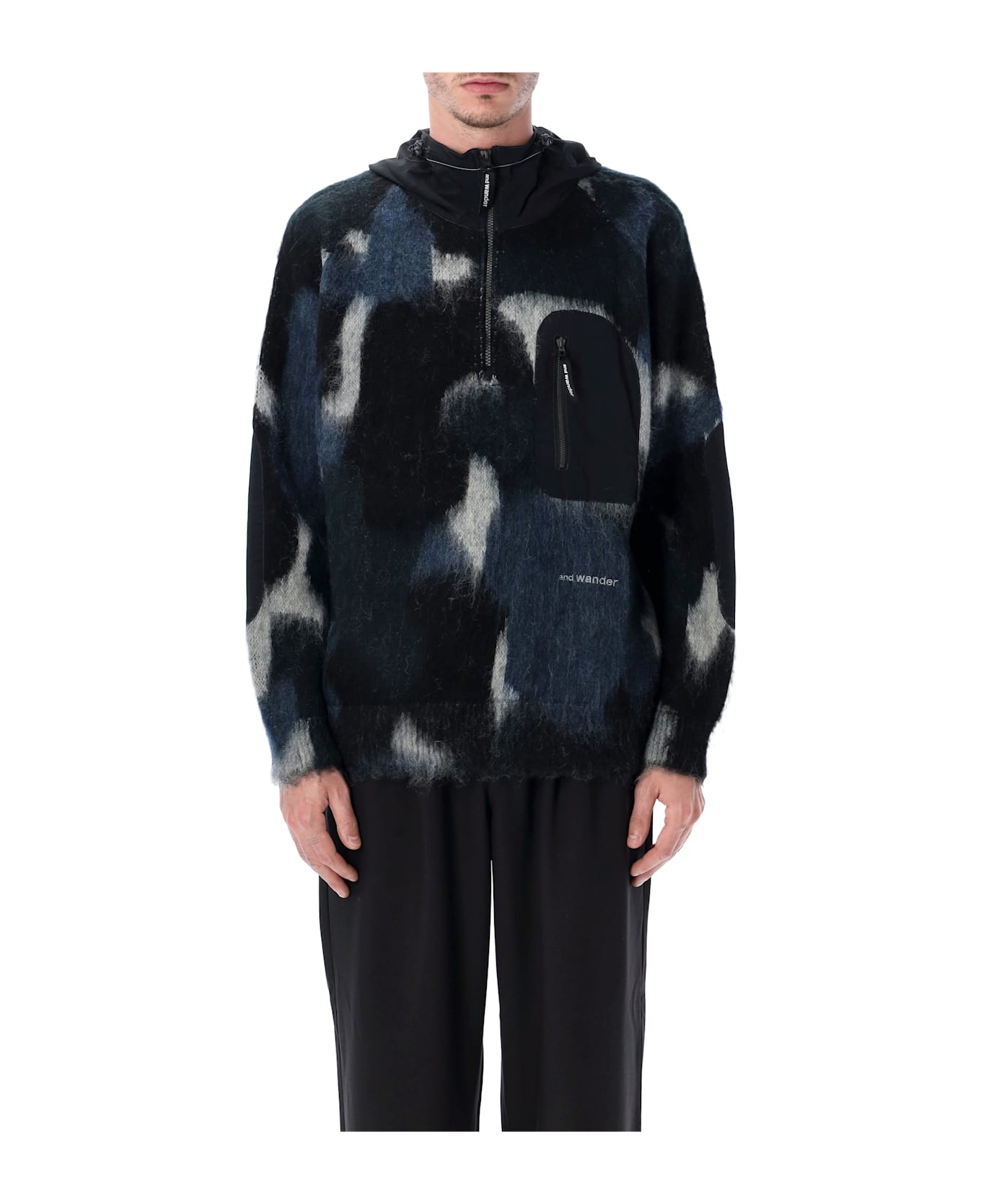 The Mix Shaggy Knit Hoodie By And Wander Merges Technical Detailing With Soft, Tactile Materials. Crafted From A Luxurious Wool And Mohair Blend, It Features A Brushed Shaggy Texture For Superior Warmth And Comfort. The Half-zip Hood In Nylon Adds A Functional Outdoor Element, While The Signature Chest Pocket And Embroidered Logo Reflect The Brand s Refined Utilitarian Design. Nylon Hood, Elbow Patches And Chest Pocket Half-zip Front Closure Embroidered Logo At Front Rib-knit Cuffs And Hem Relaxed Fit Andrea Is 1,90 M And Wears Size L/xl