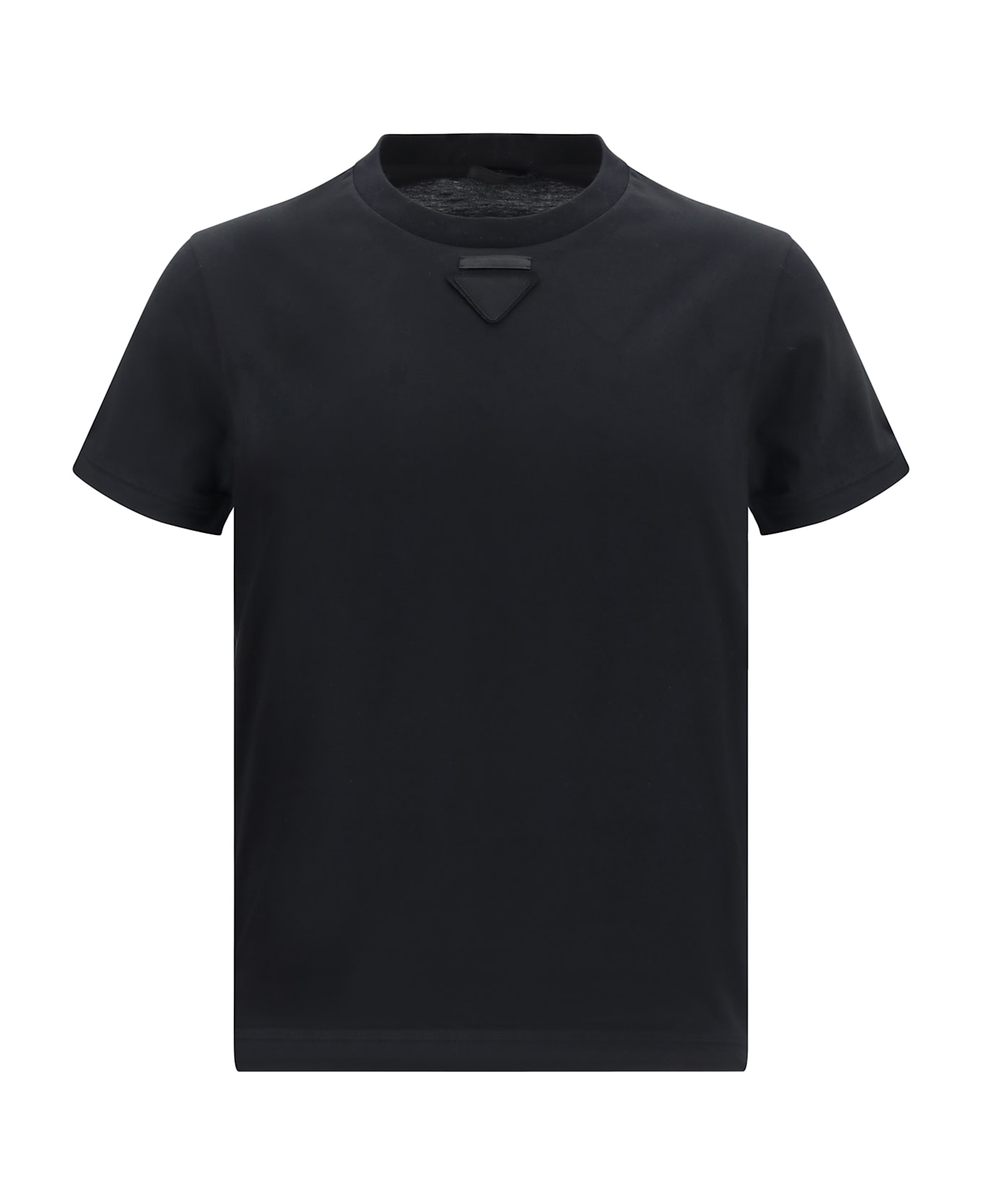 The mouldable cotton t-shirt by prada reimagines a wardrobe staple with a dynamic, movement-inspired design. its classic crew-neck silhouette is enhanced by mouldable details at the neckline, sleeves, and hem, allowing the piece to be shaped and worn with versatility. short sleeves and a straight hem keep the look clean and minimal, while the tone-on-tone conceptual triangle logo and tailoring label add a refined yet contemporary signature.