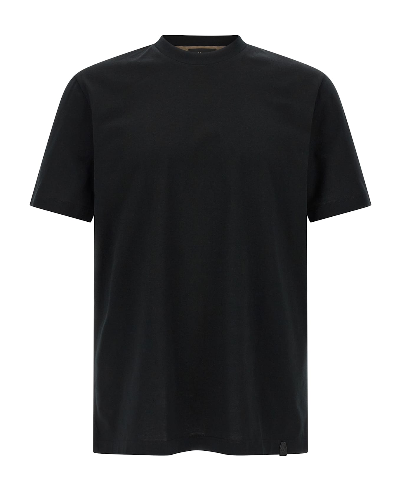 Carbonated cotton T-shirt, tone-on-tone leather fly with front embossed logo, crew neck, short sleeves, side slits. SUSTAINABLE: This garment contains GOTS certified cotton. The Global Organic Textile Standard (GOTS) is a voluntary standard obtained through independent third-party verification.