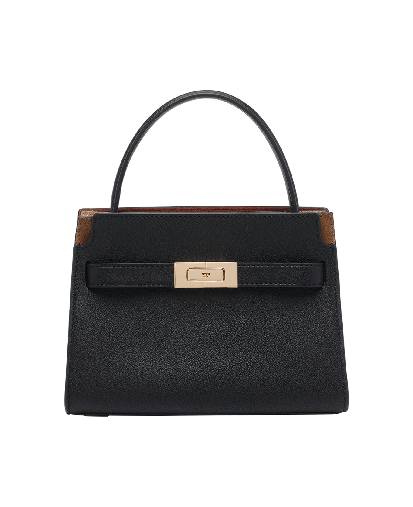 Tory Burch black Lee Radziwill petite handbag, one inner slot, 2 external pockets, one pocket with closure , one handle, adjustable and removable shoulder strap