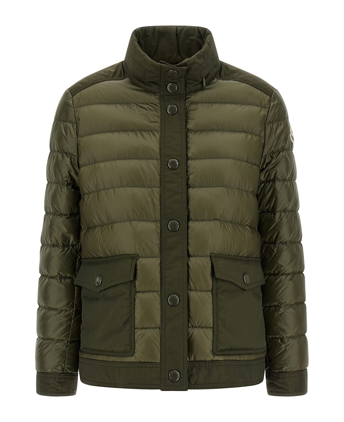 'Origan' down jacket in quilted technical fabric with goose down padding with tone-on-tone water-repellent fabric details, high neck with removable hood, front snap button closure, pockets, long cuffed sleeves and felt logo patch.