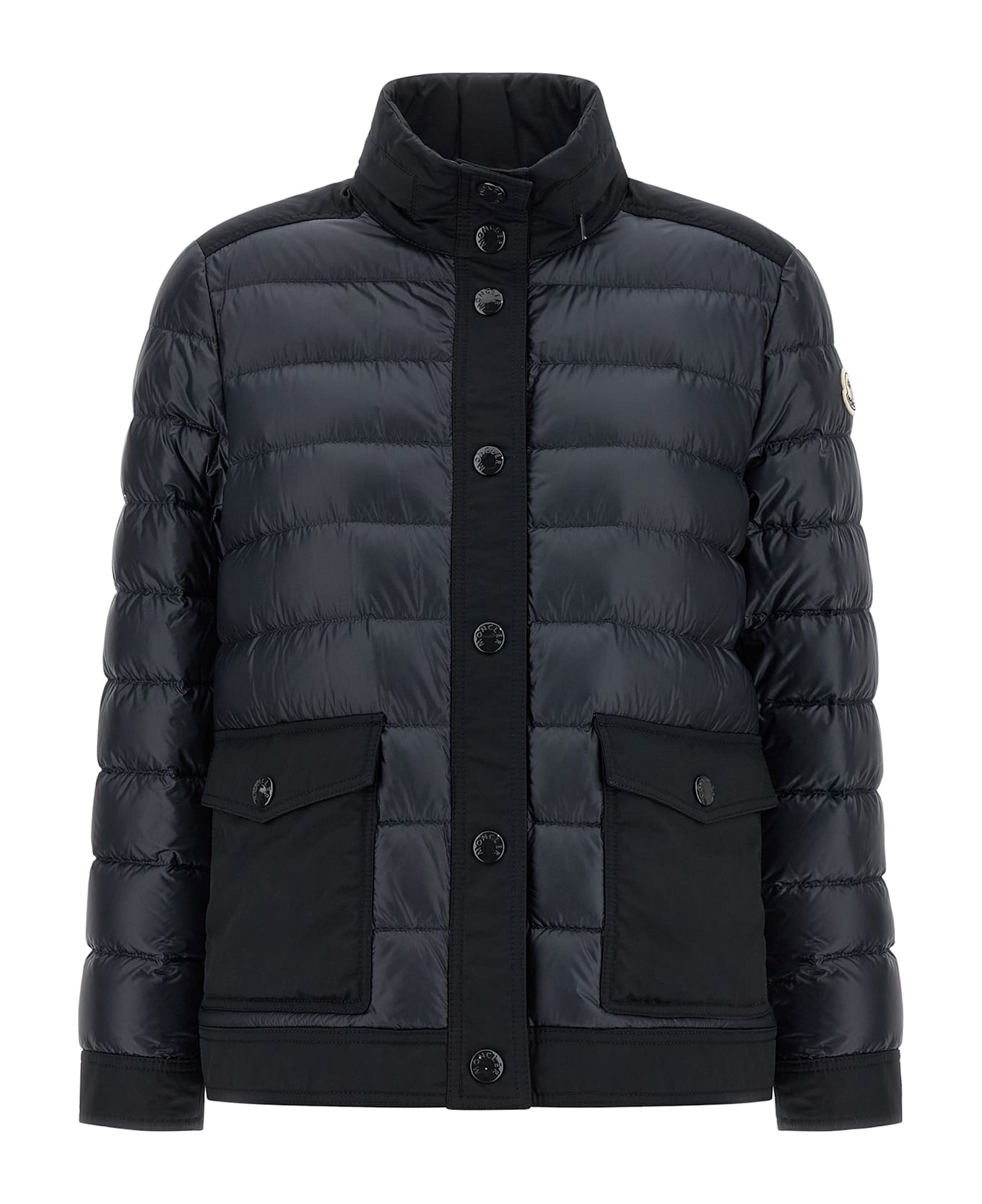 'Origan' down jacket in quilted technical fabric with goose down padding with tone-on-tone water-repellent fabric details, high neck with removable hood, front snap button closure, pockets, long cuffed sleeves and felt logo patch.