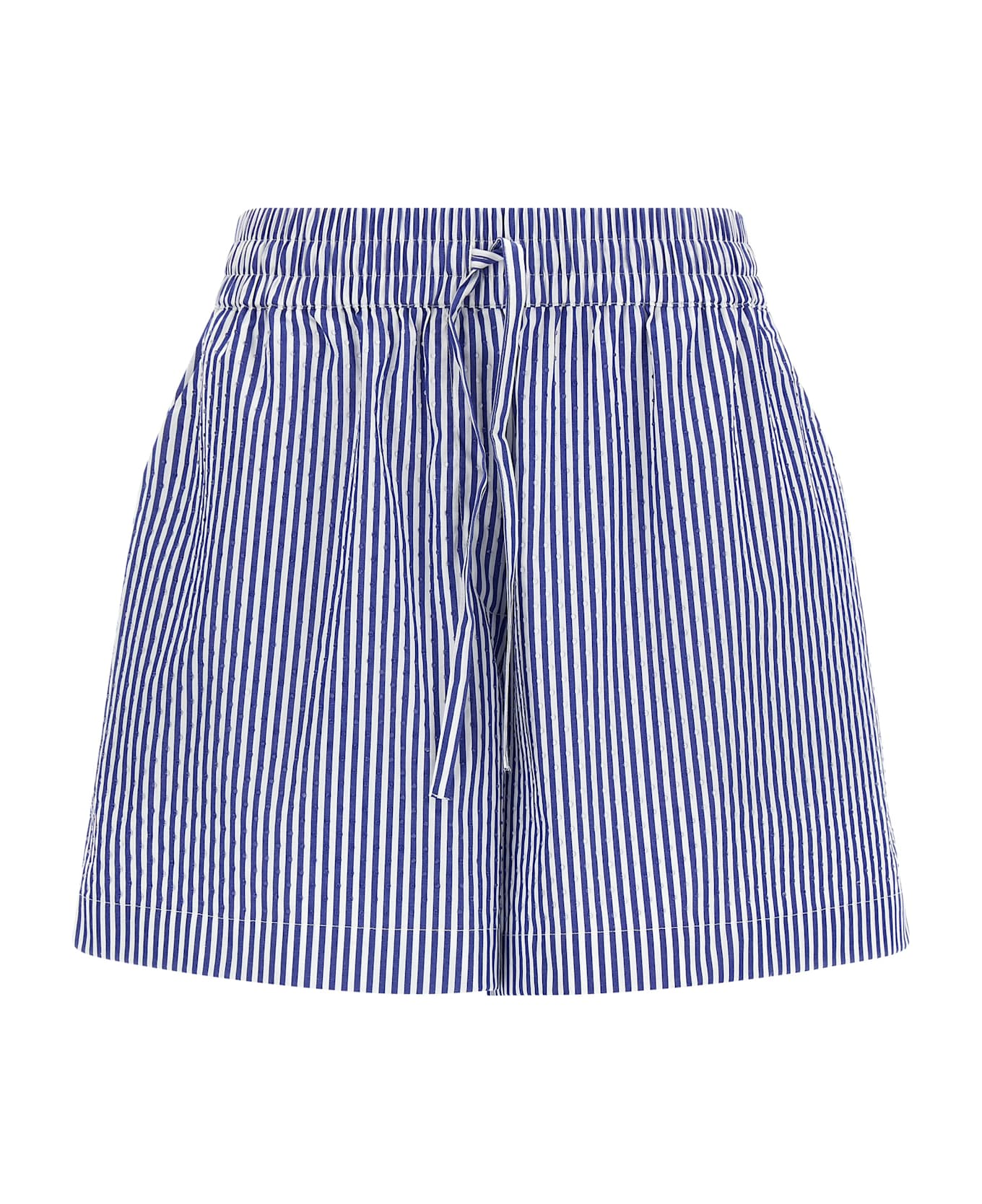 'Cashine' striped cotton poplin shorts with all-over rhinestones, wide leg, drawstring elastic waistband, pockets.