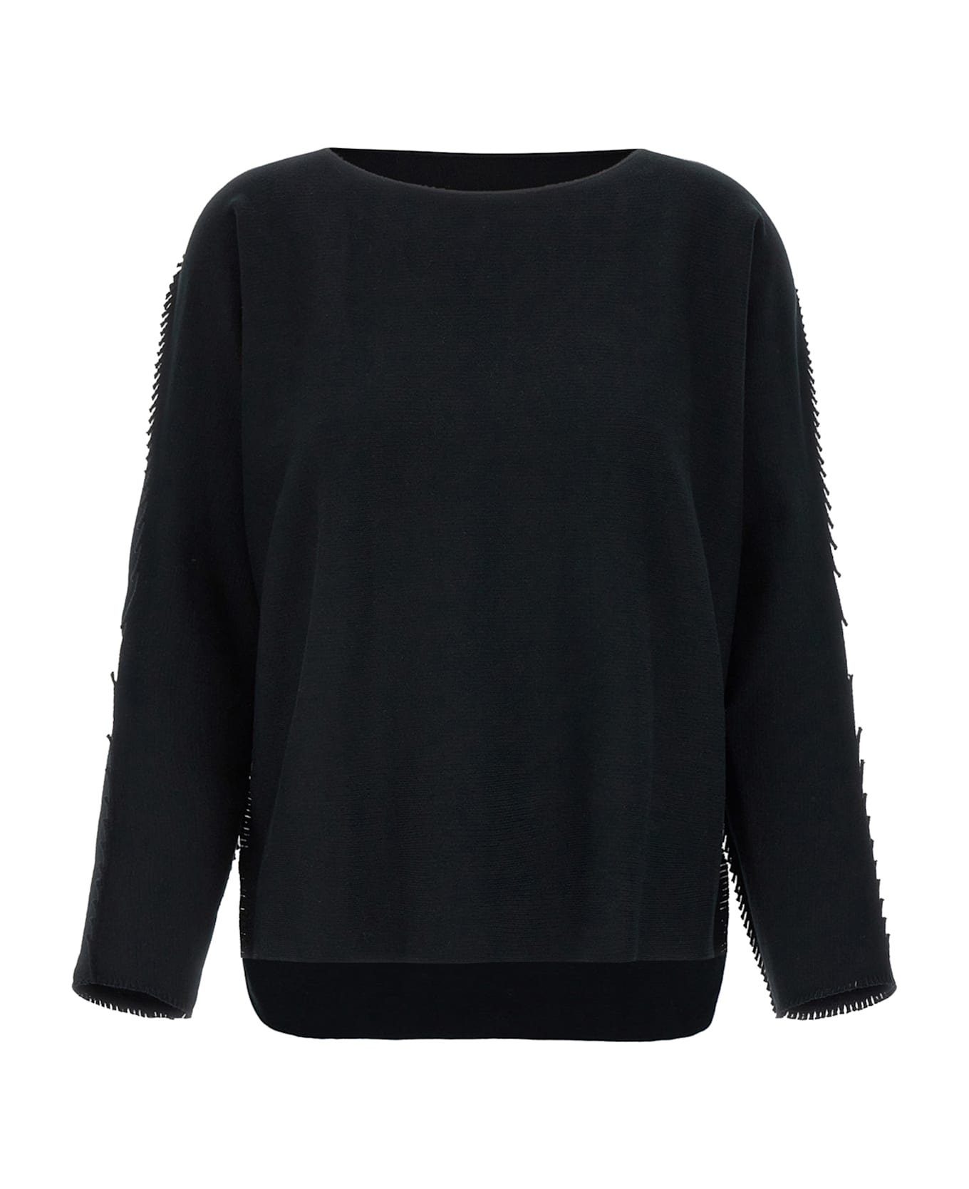 'Campagne' crewneck sweater in stretch cotton blend with bat sleeves, raw cut edges with fringed sleeves,