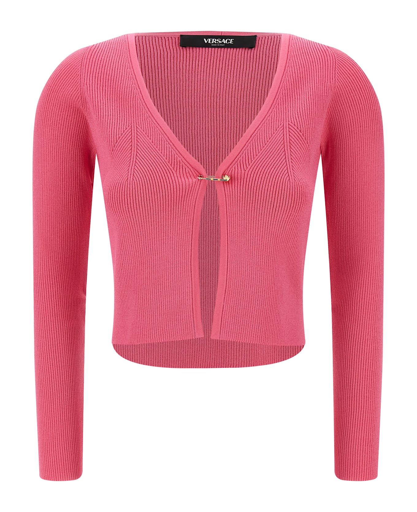 Stretch ribbed knit cardigan, crop style dressing gown style with removable metal 'Safety Pin' on the front, long sleeves, V-neck. Composition: 83% viscose, 17% polyester
