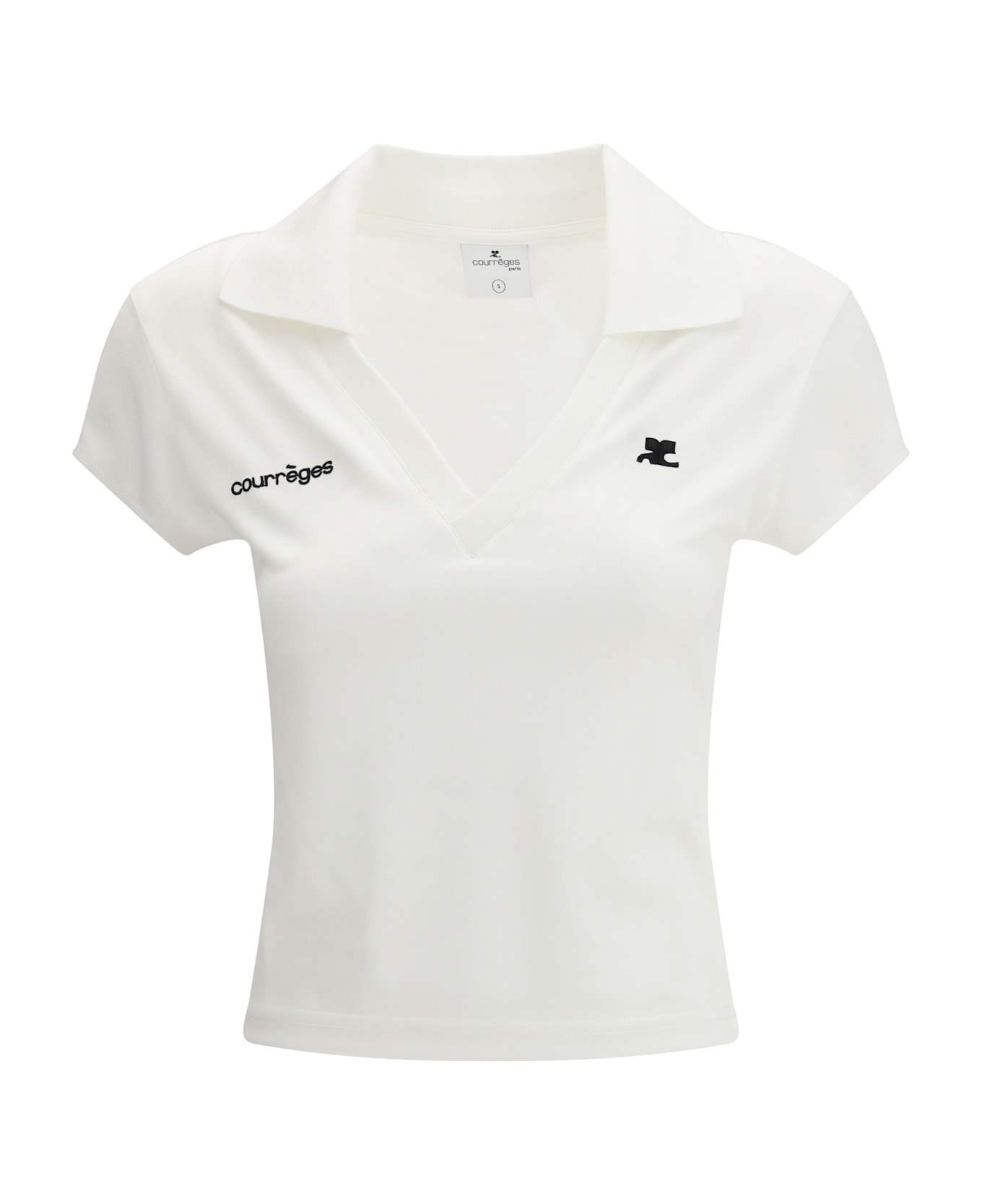 The sports cropped polo by courrèges is a short, slim-fit silhouette crafted from soft cotton. it features a v-neckline, classic collar, and short sleeves, blending sporty ease with the brand s signature minimalist aesthetic.