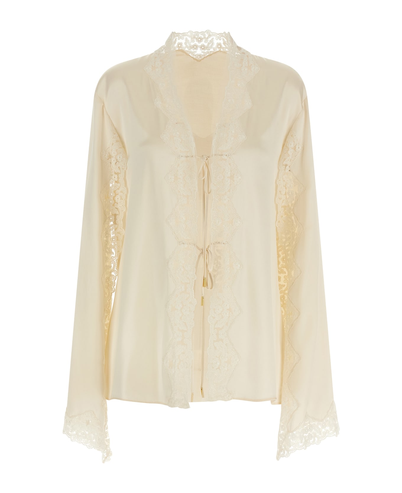 Shiny satin shirt with tone-on-tone lace inserts, dressing gown style with front laces and long cape sleeves.
