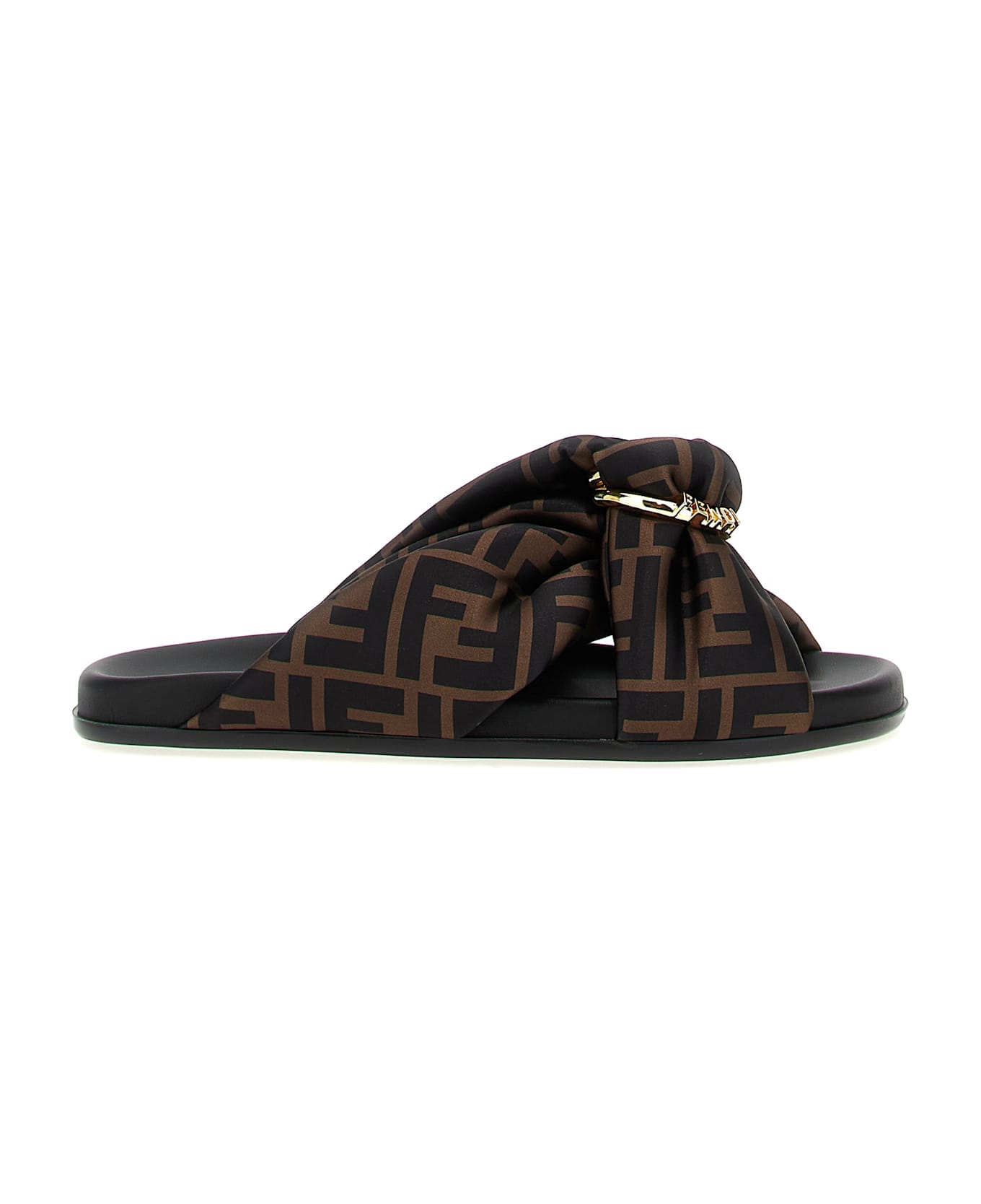 Fendi Feel' satin slides with iconic FF pattern, double padded band and decorative D-ring buckle with three-dimensional Fendi lettering, leather insole, leather sole. Composition: 97% polyester, 3% elastane