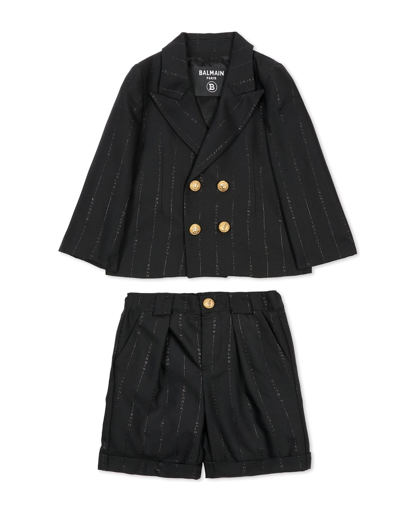 Black suit in virgin wool consisting of jacket and shorts. Double-breasted jacket, lapel collar, long sleeves. Blue shorts, elasticated waist, belt loops, zip and button, side welt pockets. They are embellished with golden logoed buttons, and logo.