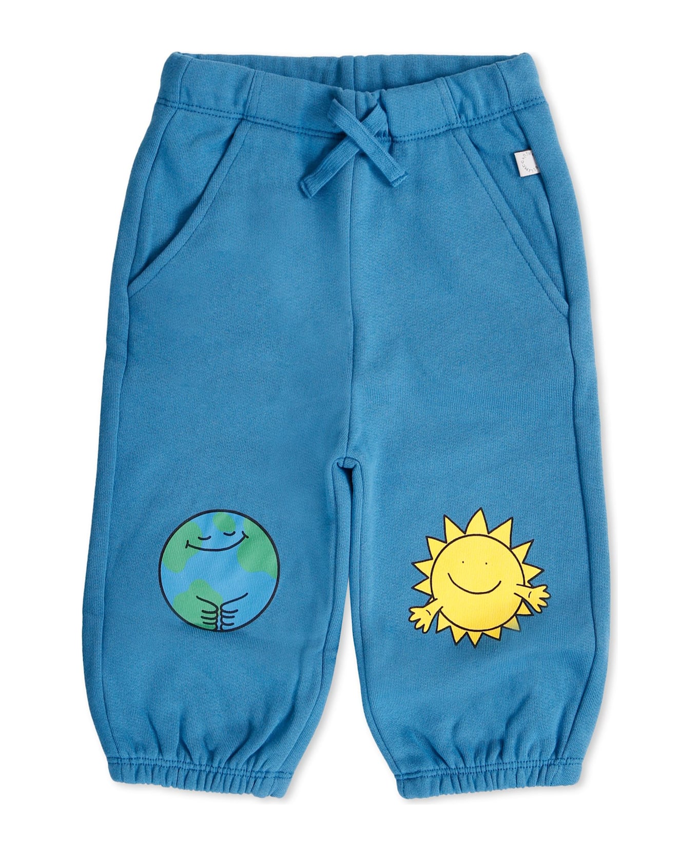 Blue pants made of sustainable cotton fleece, with elasticated waistband with drawstring and side pockets. They are embellished with a side logo patch, smiling world and sun on the bottom.