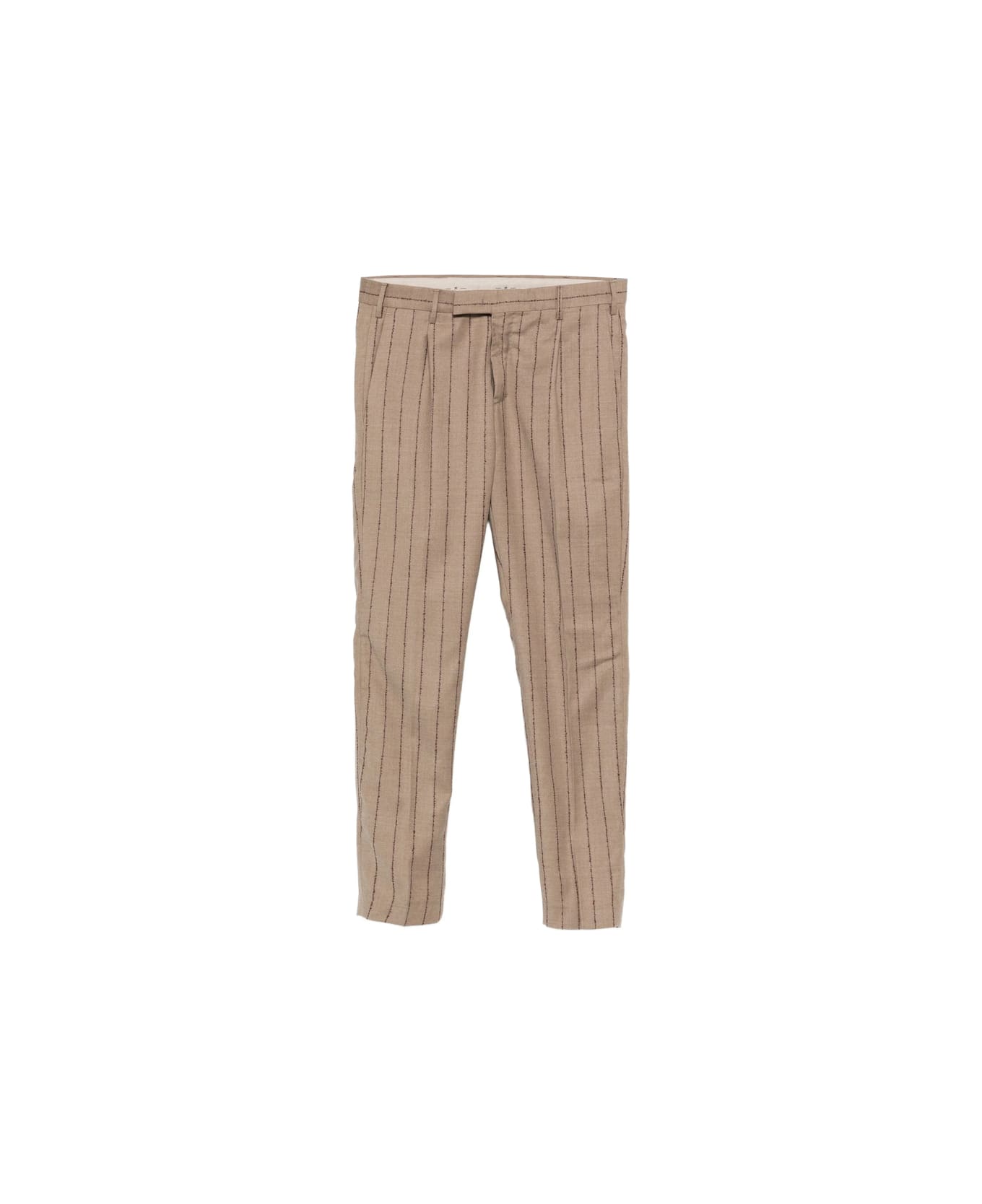 brown stripe pattern pleated details button fastening belt loops slash pockets