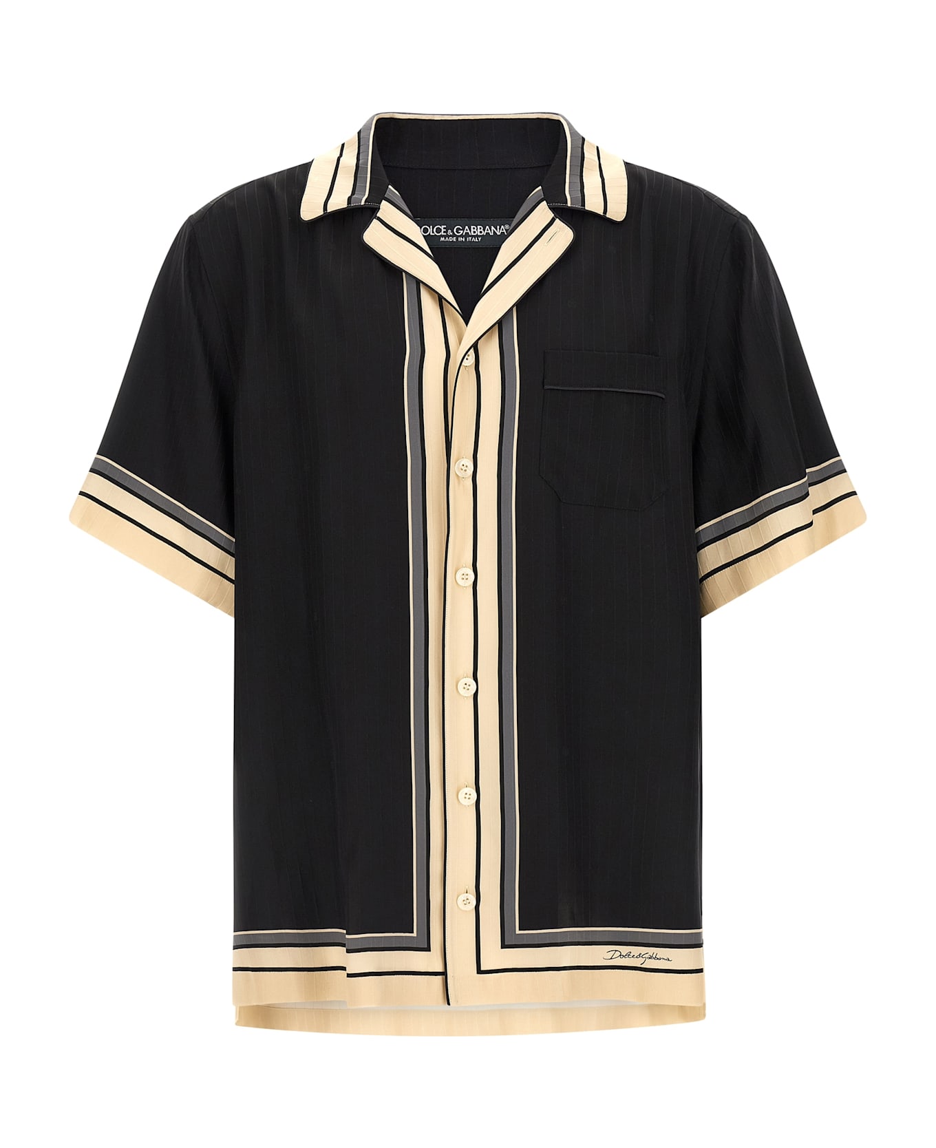 'Hawaii' silk shirt with logo and stripe print, 'Vanity' collar, breast pocket, front button closure, short sleeves, side slits. The differences in print placement you might find on this product is a characteristic of Dolce&Gabbana's Handmade products. A peculiarity that makes each garment or accessory unique and exclusive.