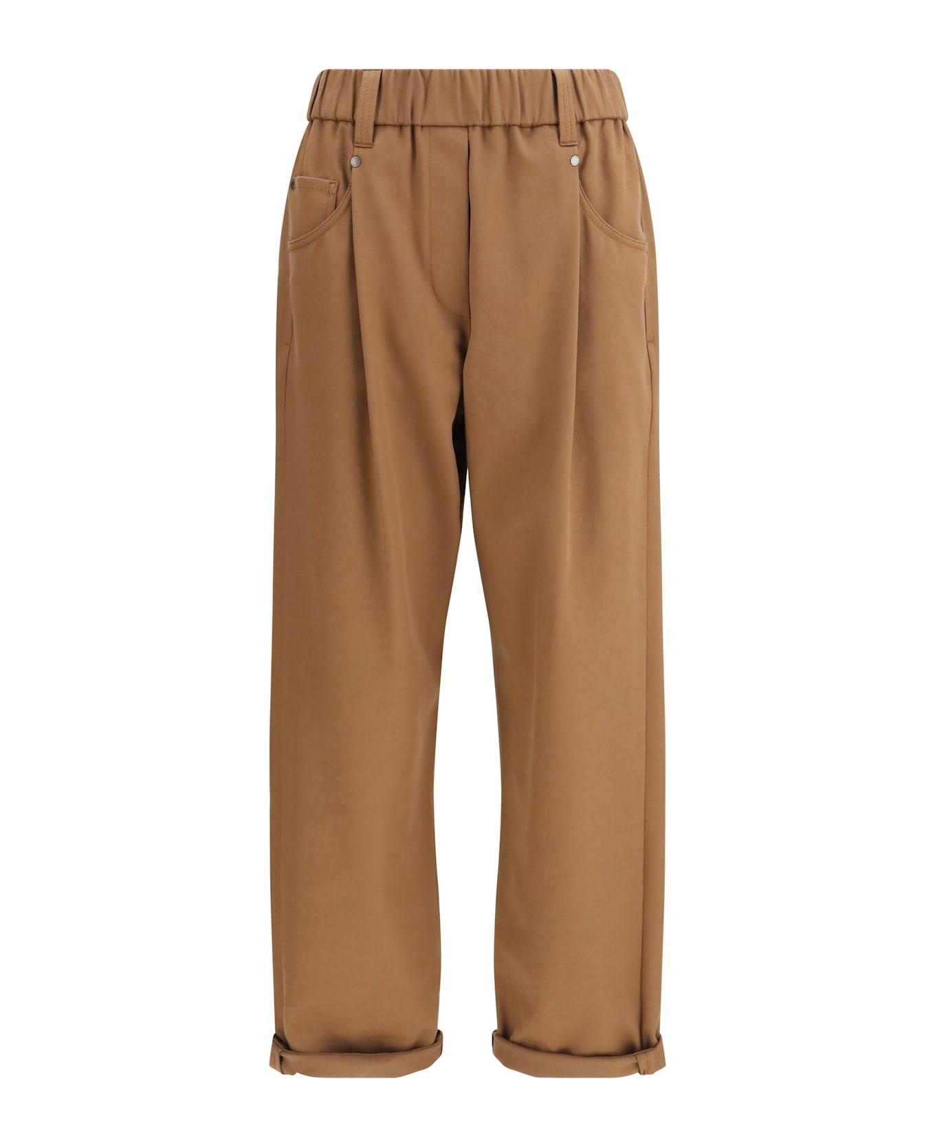 The cotton trousers by brunello cucinelli reinterpret essential tailoring with quiet refinement. crafted in a classic five-pocket design, they feature an elasticated waistband with belt loops that balances structure and comfort. two front pleats add subtle volume, while the high-rise waist and regular fit create a clean, elongated silhouette. finished with a cuffed hem and a monochrome palette, they embody the brand s understated elegance and versatile sophistication.