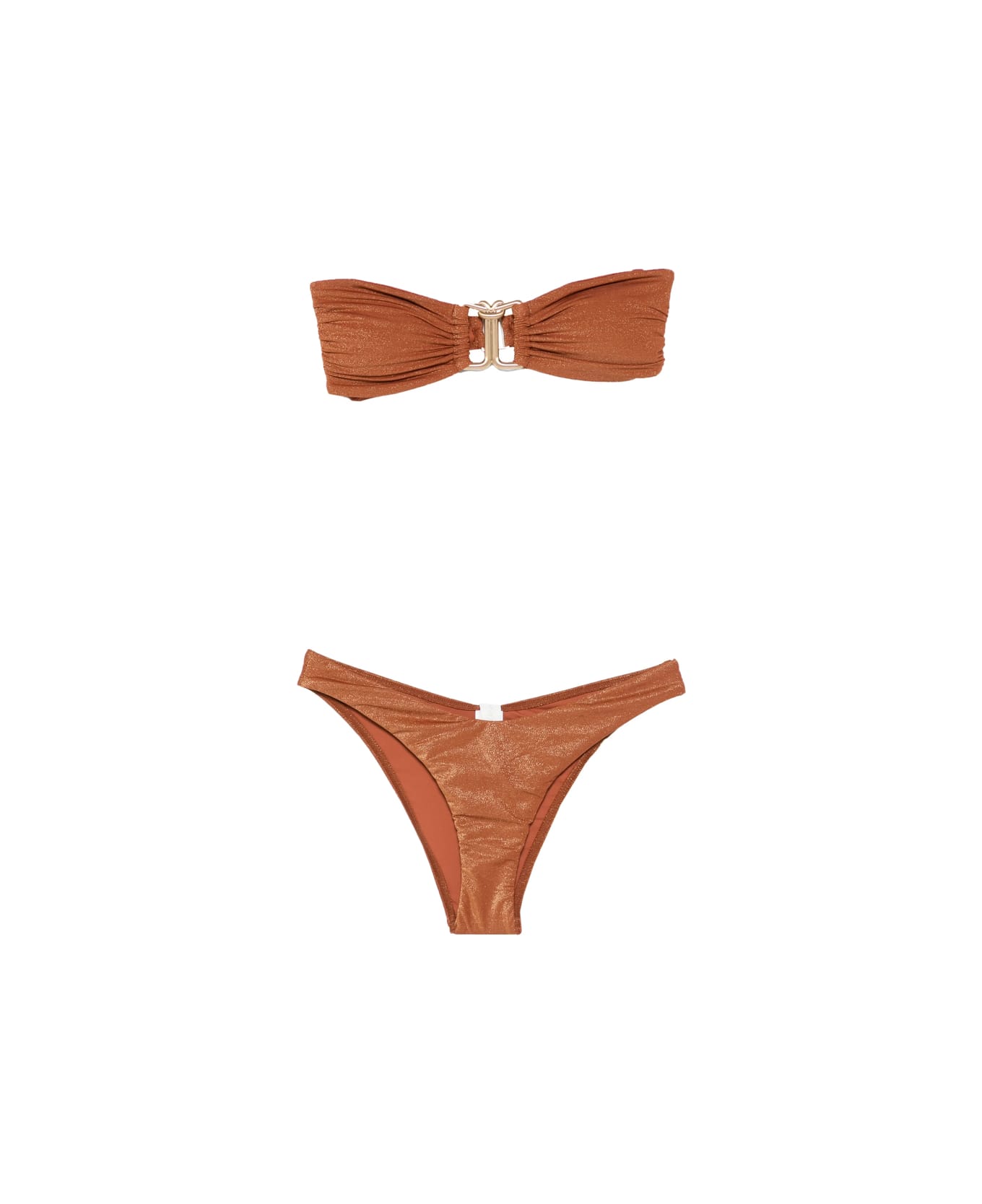 toffee brown metallic threading buckle detail ruched detail two-piece set Be mindful to try on swimwear over your own garments.