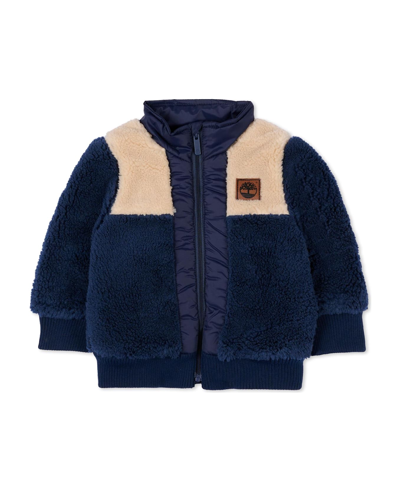 Long-sleeved blue faux fur jacket with a front zip fastening, side pockets, and ribbed cuffs and hem. It is embellished with a logo patch on the chest.