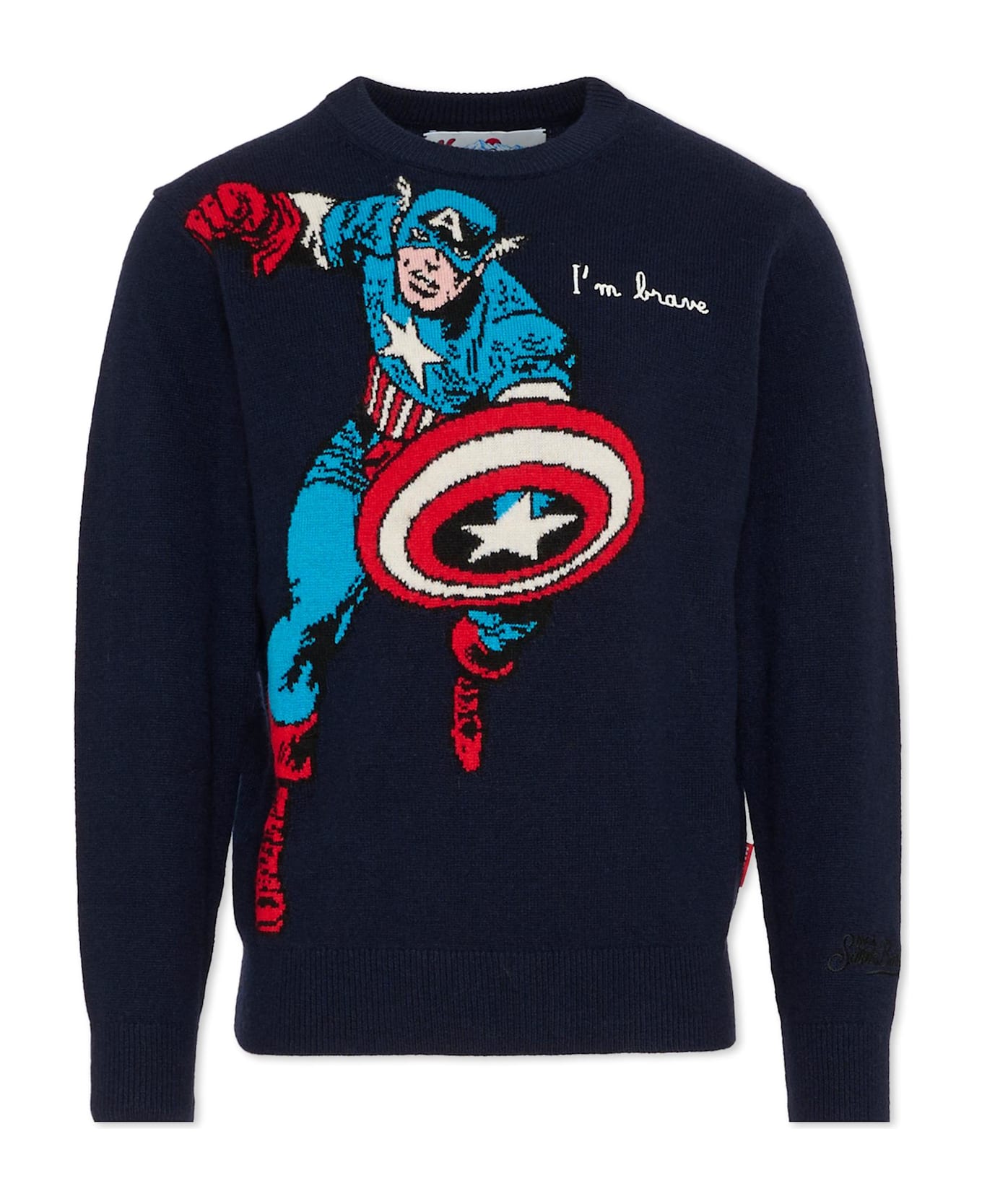 Blue long-sleeved sweater with a ribbed crew neck, cuffs, and hem. It is embellished with Captain America inlay on the front and embroidered logo on the sleeve. This is a Marvel x Mc2 Saint Barth collaboration.