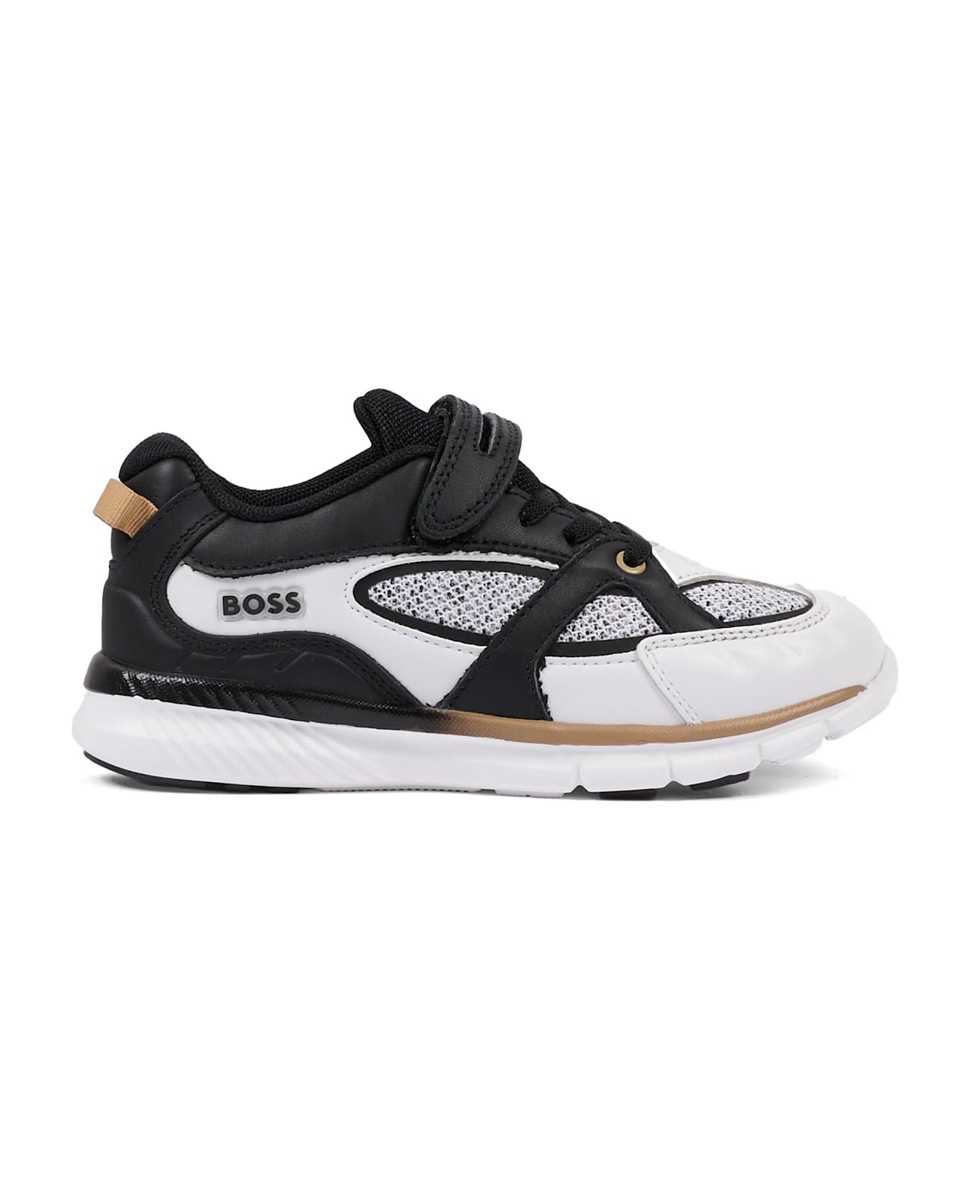 Black sneakers with rubber soles, velcro fastening, elastic laces, a pull tab at the back, and a round toe. They are embellished with a side logo.