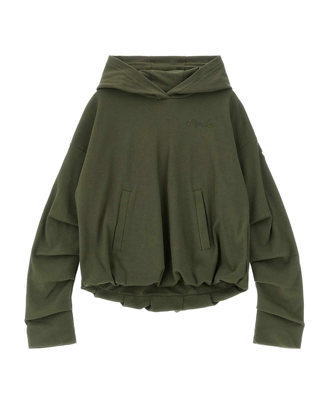 KIDS Double face cotton hoodie with ribbed outer side, tone-on-tone logo embroidery on the front, pockets, long pleated sleeves with dropped shoulders, boxy style with rolled hem on the hem.