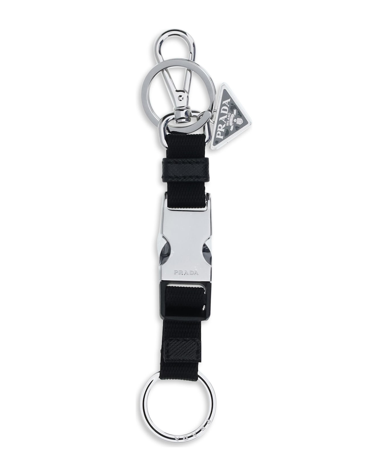 The fabric keyring by prada is a practical and modern accessory, made of durable fabric and embellished with the logo embossed on the security buckle. equipped with a key ring and carabiner, it offers a dual mode of use, combining functionality and style in an essential and distinctive design. Composition: 100% % Nylon