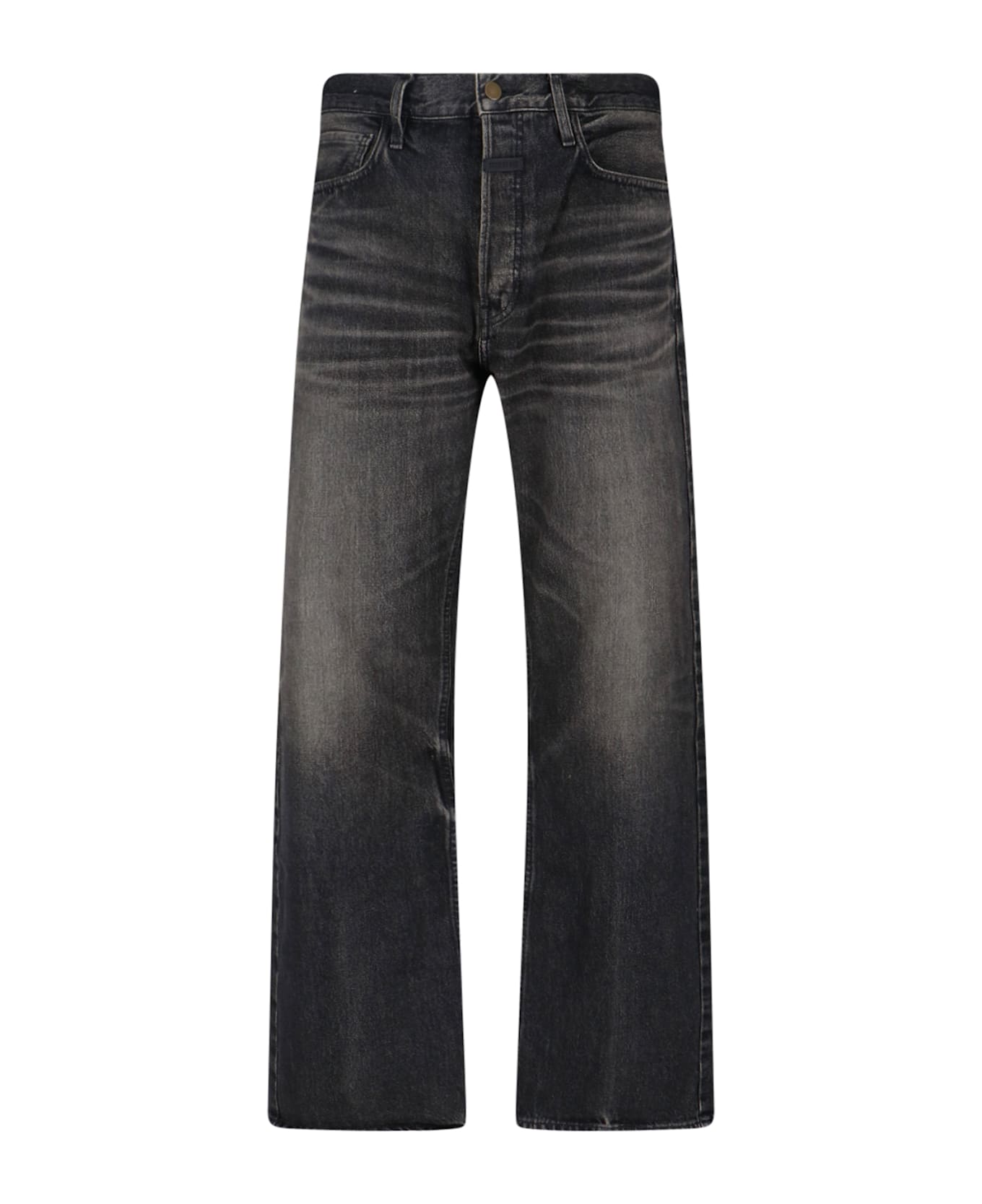 Fear Of God straight jeans in black denim with mid waist, belt loops, button closure with logo label detail, five pockets design, straight leg. Composition: 100% Cotton