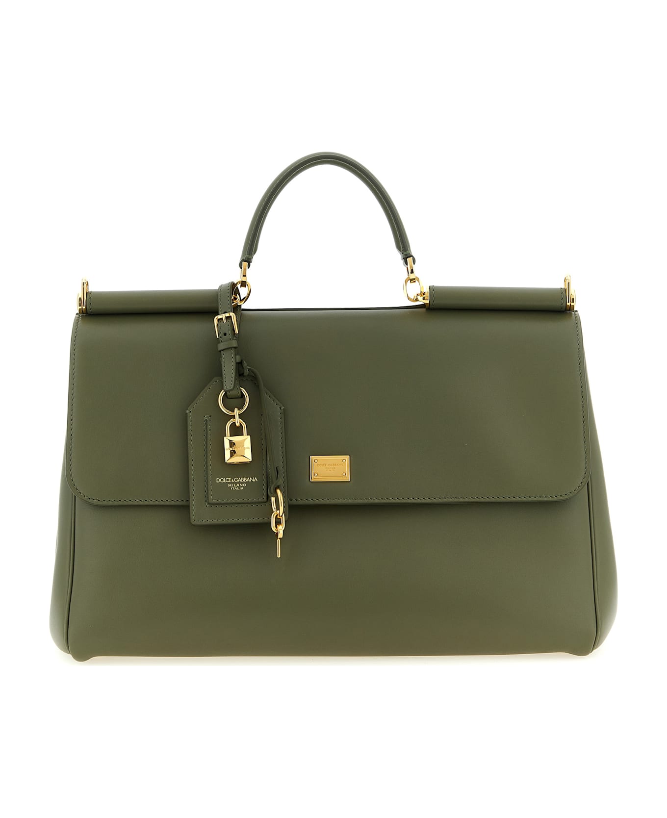 'My Sicily' maxi handbag in plongé calf leather, vintage brass galvanic metal details, flap closure with tuck-in mechanism and monogalvanic metal tag with front engraved logo, fixed handle, rigid bottom with metal feet, back zip pocket and embossed logo, adjustable and removable shoulder strap, name tag with key and removable metal padlock.