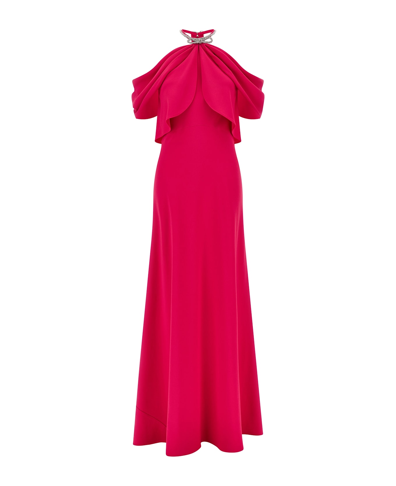 Long dress in cady, American neckline with necklace detail with metal bow, crystals and rhinestones with snap hook closure and back zip, draped dropped shoulder, flared silhouette skirt.
