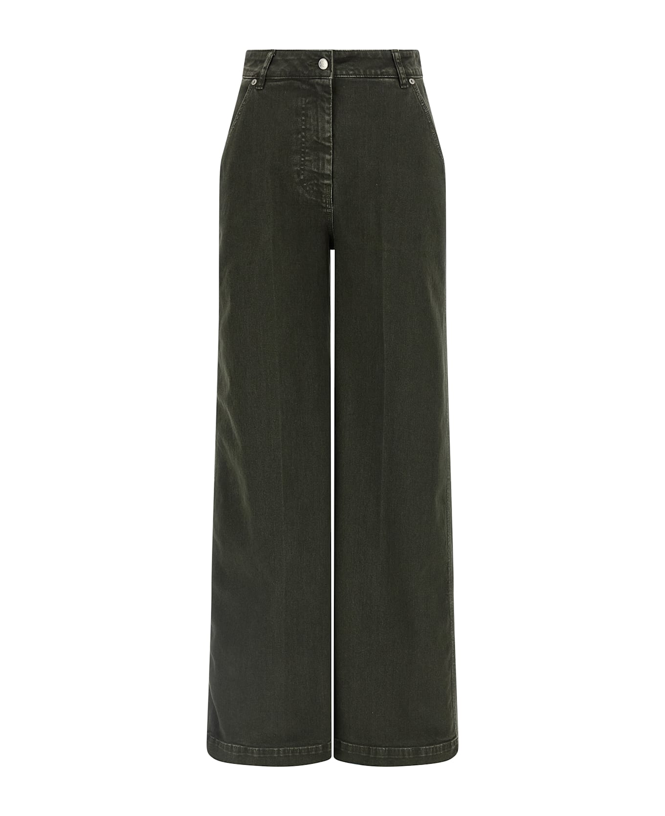 Garment-dyed cotton denim jeans, high waist, very wide leg, stretched pleat, front zip and button closure, pockets, back logo tag. Composition: 98% cotton, 2% elastane