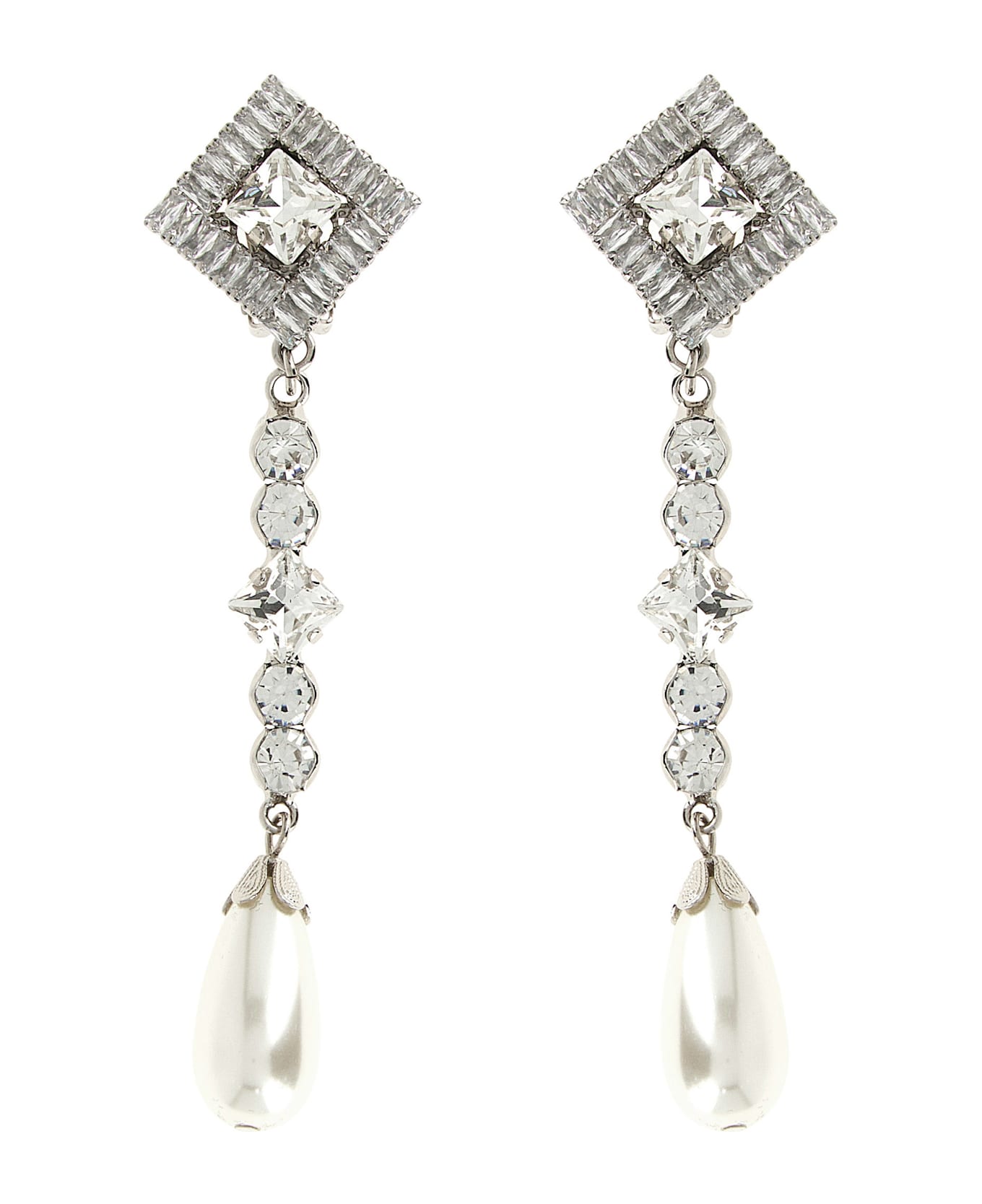 Metal earrings with crystals, pearls and baguette crystals, pendant model, clip closure. ITEM CANNOT BE RETURNED