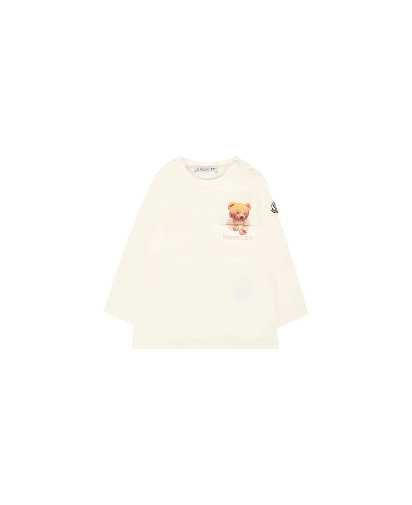 white cotton-blend long sleeves crew neck chest pocket Teddy Bear print sleeve logo-patch shoulder snap-button fastening