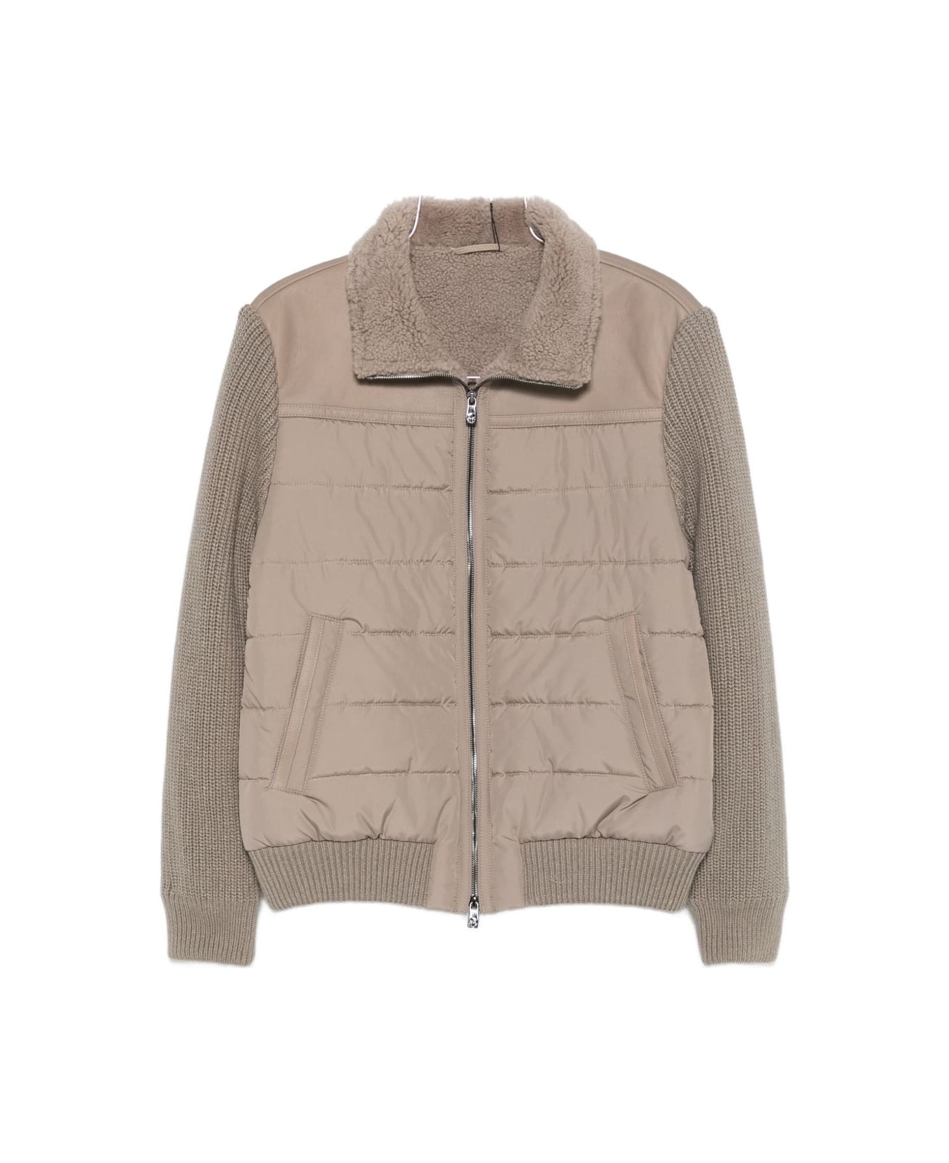 Light beige shearling collar, quilted front, ribbed sleeves, front zip closure, front welt pockets