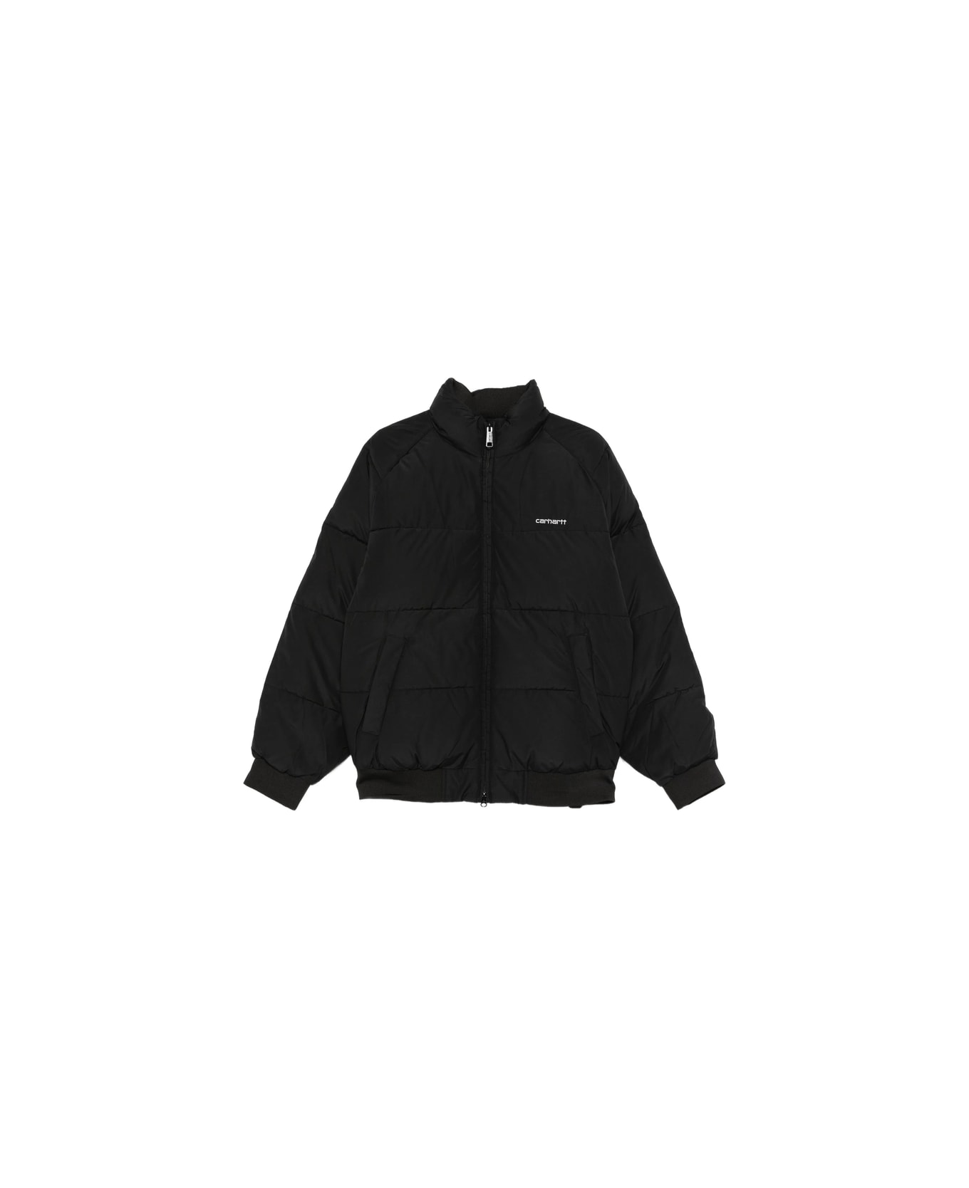 black quilted design zip fastening logo detail ribbed cuffs and hem high neck